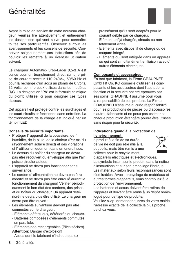 Protéger l'appareil de la poussière, de l' humidité, de la pluie, de la chaleur (Par ex. du rayonnement solaire direct) et des vibrations et utliser uniquement dans un endroit sec. Le dessus du bolier du chargeur ne devra. pas être recouvert ou enveloppé afin que l'air puisse circuler autour. L'apparel ne devra pas fonctionner sans surveillance. Le cordon d' alimentation ne devra pas être modifié et ne devra pas être enroulé durant le fonctionnement du chargeur Vérifier périodi- quement le bon état des cordons, des prises et du boîtier du chargeur. Un appareil dété- rioré ne devra plus être utilisé. Le chargeur ne devra pas être ouvert! Les éléments suivantsne devront pas être connectés sur le chargeur: - Eléments défectueux, détériorés ou chauds. - Batteries composées d'éléments commutés en parallèle. - Eléments non rechargeables (Piles sèches). Attention: Danger d'explosion! Composants et accessoires: En tant que fabricant, la Firme GRAUPNER GmbH & Co. KG conseille d'utiliser les com- posants et les accessoires dont l'aptitude, la fonction et la sécurité ont été éprouvés par