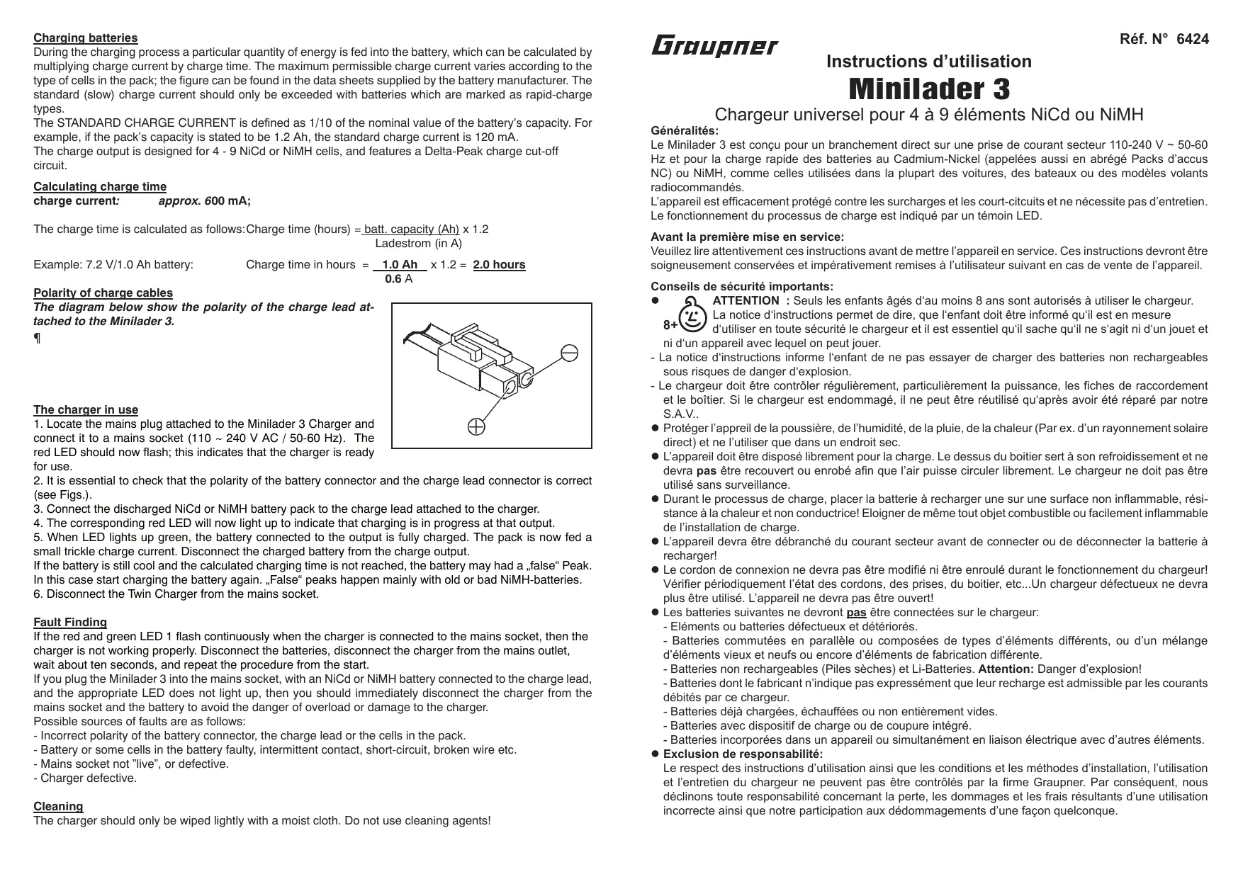Le COURANT DE CHARGE NORMAL correspond au 1/10 de la capacité nominale de l’accu (Par ex., pour une capacité de 1,2 Ah, le courant de charge normal est de 120 mA). La sortie de charge pour 4 à 9 éléments NiCd ou NiMH dispose d’une coupure de charge par Delta Peak. Courant de charge: 600 mA Le temps de charge se calcule ainsi: Temps de charge en H. = Capacité de l’accu (en Ah) x 1,2 Courant de charge (en A) Exemple: Accu de 7,2 V/1,0 Ah: Temps de charge en H. = 1,0 Ah x 1,2 = 2.0 Heures 0,6 A Polarités de cordon de charge: Les polarités du Minilader 3 est représentées ci-dessous. S’assurer des bonnes polarités de la prise de charge de l’émetteur et de celles de l’accu à charger. Légendes des Figures: Fonctionnement: Utilisation 1. Brancher la prise du Minilader 3 sur une prise de courant secteur (110~240V AC / 50-60 Hz). Le LED rouge doivent clignoter une fois pour indiquer le fonctionnement correct du chargeur. 2. S’assurer absolument de la correspondance des polarités entre la prise de l’accu et celle du cordon de charge (Voir les illustrations). 3. Relier le pack d’accus NiCd ou NiMH vide à charger au chargeur avec un cordon de charge adapté. 4. Chaque LED rouge correspondant signale le processus de charge de chaque raccordement. 5. Le LED vert s’allume, c’est que l’accu sur le raccordement est chargé. L’accu continuera a être chargé avec un courant d’entretien. Débrancher alors l’accu chargé du raccordement de charge. Débrancher le Minilader 3 du courant secteur. Avertissement d’erreur: Si au branchement du chargeur les LED vert et rouge clignotent en permanence, c’est que celui-ci ne fonctionne pas correctement. Déconnecter l’accu et débrancher le chargeur du courant secteur, puis recommencer après environ 10 secondes. Si, avec l’accu connecté, le témoin de contrôle correspondant au cordon de charge ne s’allume pas après le branchement du chargeur sur le courant secteur, débrancher immédiatement celui-ci pour éviter une surcharge ou sa détérioration et déconnecter l’accu. Les causes possibles d’erreur peuvent être par exemple: - Inversion de polarité de la prise de l’accu, du cordon de charge ou des éléments de l’accu. - Accu ou éléments de celui-ci défectueux, contact intermittent, court-circuit, rupture, etc... - Prise de courant secteur ne débitant pas de courant ou défectueuse. - Chargeur défectueux. Nettoyage: Essuyer l’appareil uniquement avec un chiffon humide (N’utiliser aucun détergent).