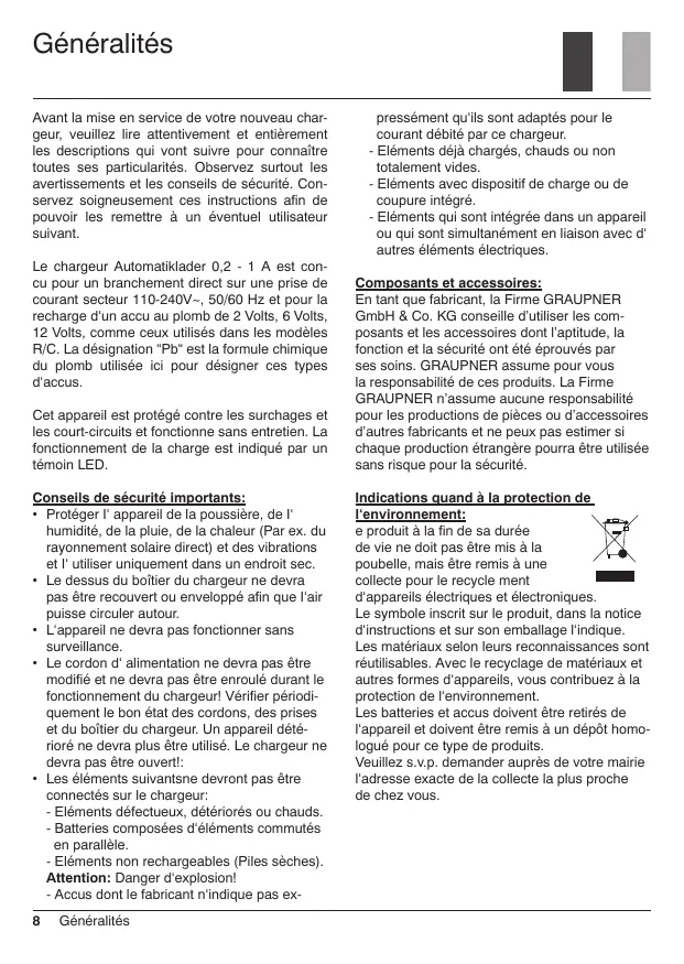 Protéger l'appareil de la poussière, de l' humidité, de la pluie, de la chaleur (Par ex. du rayonnement solaire direct) et des vibrations et utliser uniquement dans un endroit sec. Le dessus du bolier du chargeur ne devra. pas être recouvert ou enveloppé afin que l'air puisse circuler autour. L'apparel ne devra pas fonctionner sans surveillance. Le cordon d' alimentation ne devra pas être modifié et ne devra pas être enroulé durant le fonctionnement du chargeur Vérifier périodi- quement le bon état des cordons, des prises et du boîtier du chargeur. Un appareil dété- rioré ne devra plus être utilisé. Le chargeur ne devra pas être ouvert! Les éléments suivantsne devront pas être connectés sur le chargeur: - Eléments défectueux, détériorés ou chauds. - Batteries composées d'éléments commutés en parallèle. - Eléments non rechargeables (Piles sèches). Attention: Danger d'explosion! Composants et accessoires: En tant que fabricant, la Firme GRAUPNER GmbH & Co. KG conseille d'utiliser les com- posants et les accessoires dont l'aptitude, la fonction et la sécurité ont été éprouvés par