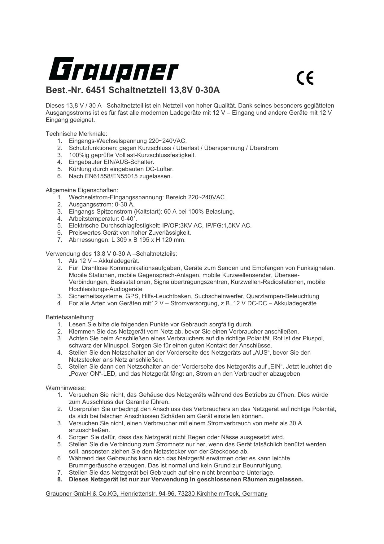 SWITCHING POWER SUPPLY 13.8V 0-30A - Alimentation électrique GRAUPNER - Notice d'utilisation et mode d'emploi gratuit