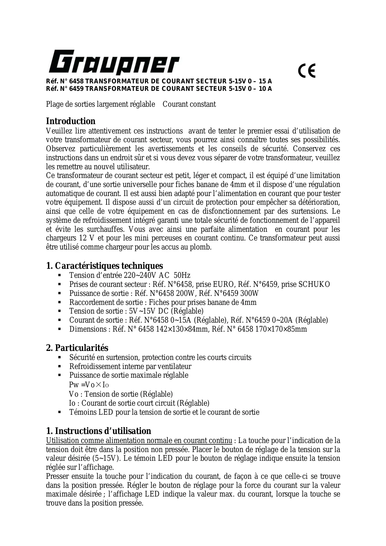 Tension d’entrée 220~240V AC 50Hz Prises de courant secteur : Réf. N°6458, prise EURO, Réf. N°6459, prise SCHUKO Puissance de sortie : Réf. N°6458 200W, Réf. N°6459 300W Raccordement de sortie : Fiches pour prises banane de 4mm Tension de sortie : 5V~15V DC (Réglable) Courant de sortie : Réf. N°6458 0~15A (Réglable), Réf. N°6459 0~20A (Réglable) Dimensions : Réf. N° 6458 142×130×84mm, Réf. N° 6458 170×170×85mm