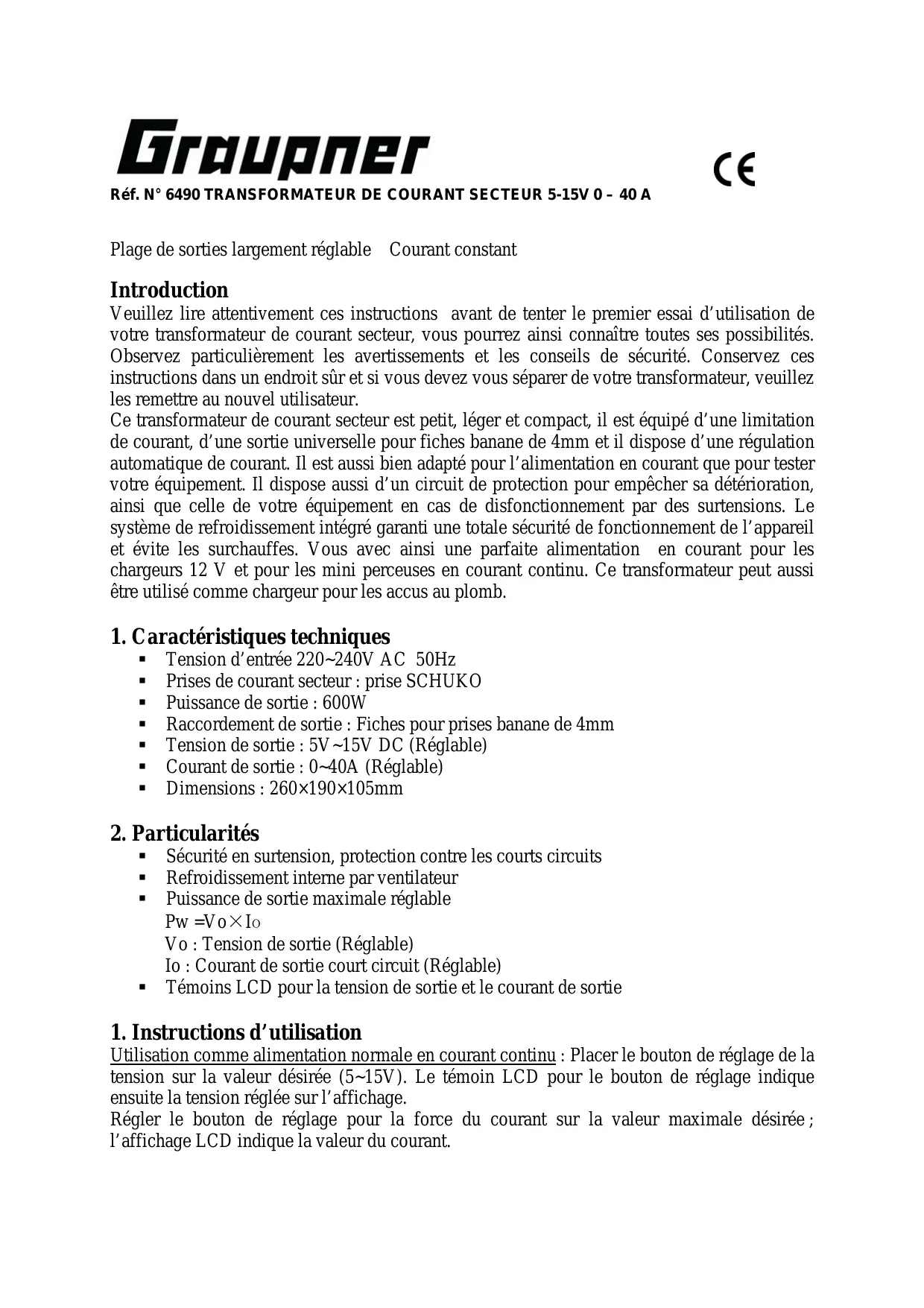SWITCHING POWER SUPPLY 5-15V 0-40A - Alimentation électrique GRAUPNER - Notice d'utilisation et mode d'emploi gratuit