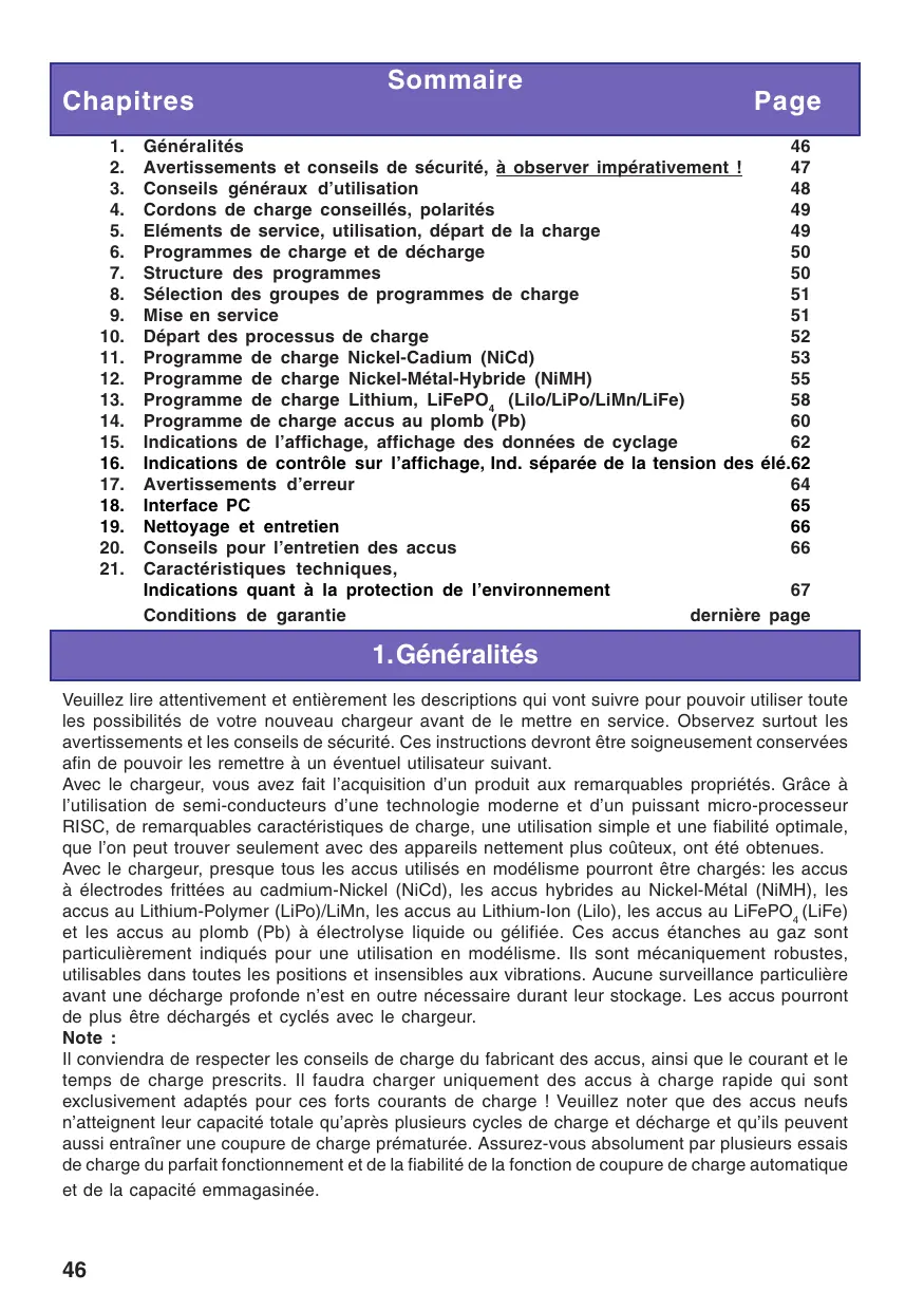 6. Programmes de charge et de décharge 50 7. Structure des programmes 50 8. Sélection des groupes de programmes de charge 51 9. Mise en service 51 10. Départ des processus de charge 52 11. Programme de charge Nickel-Cadium (NiCd) 53 12. Programme de charge Nickel-Métal-Hybride (NiMH) 55 13. Programme de charge Lithium, LiFePO, (Lilo/LiPo/LiMn/LiFe) 58 14. Programme de charge accus au plomb (Pb) 60 15. Indications de l'affichage, affichage des données de cyclage 62 16. Indications de contrôle sur l'affichage, Ind. séparée de la tension des élé.62 17. Avertissements d'erreur 64 18. Interface PC 65 19. Nettoyage et entretien 66 20. Conseils pour l'entretien des accus 66 Conditions de garantie dernière page