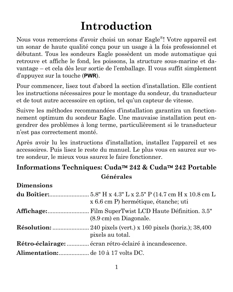 Introduction Nous vous remercions d’avoir choisi un sonar Eagle®! Votre appareil est un sonar de haute qualité conçu pour un usage à la fois professionnel et débutant. Tous les sondeurs Eagle possèdent un mode automatique qui retrouve et affiche le fond, les poissons, la structure sous-marine et davantage – et cela dès leur sortie de l’emballage. Il vous suffit simplement d’appuyez sur la touche (PWR). Pour commencer, lisez tout d’abord la section d’installation. Elle contient les instructions nécessaires pour le montage du sondeur, du transducteur et de tout autre accessoire en option, tel qu’un capteur de vitesse. Suivre les méthodes recommandées d’installation garantira un fonctionnement optimum du sondeur Eagle. Une mauvaise installation peut engendrer des problèmes à long terme, particulièrement si le transducteur n’est pas correctement monté. Après avoir lu les instructions d’installation, installez l’appareil et ses accessoires. Puis lisez le reste du manuel. Le plus vous en saurez sur votre sondeur, le mieux vous saurez le faire fonctionner. Informations Techniques: Cuda™ 242 & Cuda™ 242 Portable Générales Dimensions du Boîtier:......................... 5.8" H x 4.3" L x 2.5" P (14.7 cm H x 10.8 cm L x 6.6 cm P) hermétique, étanche; uti Affichage:.......................... Film SuperTwist LCD Haute Définition. 3.5" (8.9 cm) en Diagonale. Résolution: ....................... 240 pixels (vert.) x 160 pixels (horiz.); 38,400 pixels au total. Rétro-éclairage: .............. écran rétro-éclairé à incandescence. Alimentation:................... de 10 à 17 volts DC.
