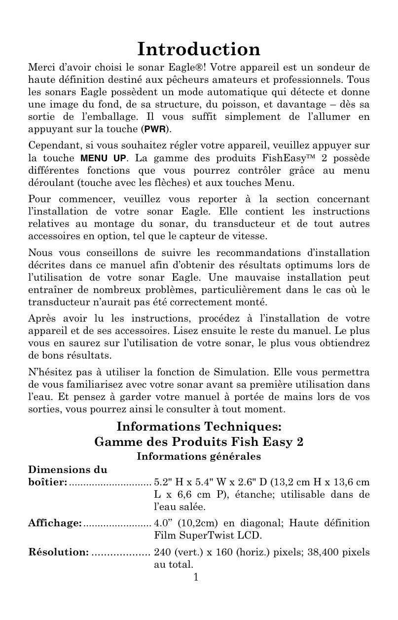 Introduction Merci d’avoir choisi le sonar Eagle! Votre appareil est un sondeur de haute définition destiné aux pêcheurs amateurs et professionnels. Tous les sonars Eagle possèdent un mode automatique qui détecte et donne une image du fond, de sa structure, du poisson, et davantage – dès sa sortie de l’emballage. Il vous suffit simplement de l’allumer en appuyant sur la touche (PWR). Cependant, si vous souhaitez régler votre appareil, veuillez appuyer sur la touche MENU UP. La gamme des produits FishEasy 2 possède différentes fonctions que vous pourrez contrôler grâce au menu déroulant (touche avec les flèches) et aux touches Menu. Pour commencer, veuillez vous reporter à la section concernant l’installation de votre sonar Eagle. Elle contient les instructions relatives au montage du sonar, du transducteur et de tout autres accessoires en option, tel que le capteur de vitesse. Nous vous conseillons de suivre les recommandations d’installation décrites dans ce manuel afin d’obtenir des résultats optimums lors de l’utilisation de votre sonar Eagle. Une mauvaise installation peut entraîner de nombreux problèmes, particulièrement dans le cas où le transducteur n’aurait pas été correctement monté. Après avoir lu les instructions, procédez à l’installation de votre appareil et de ses accessoires. Lisez ensuite le reste du manuel. Le plus vous en saurez sur l’utilisation de votre sonar, le plus vous obtiendrez de bons résultats. N’hésitez pas à utiliser la fonction de Simulation. Elle vous permettra de vous familiarisez avec votre sonar avant sa première utilisation dans l’eau. Et pensez à garder votre manuel à portée de mains lors de vos sorties, vous pourrez ainsi le consulter à tout moment. Informations Techniques: Gamme des Produits Fish Easy 2 Informations générales Dimensions du boîtier: ............................. 5.2" H x 5.4" W x 2.6" D (13,2 cm H x 13,6 cm L x 6,6 cm P), étanche; utilisable dans de l’eau salée. Affichage: ........................ 4.0’’ (10,2cm) en diagonal; Haute définition Film SuperTwist LCD. Résolution: ................... 240 (vert.) x 160 (horiz.) pixels; 38,400 pixels au total.