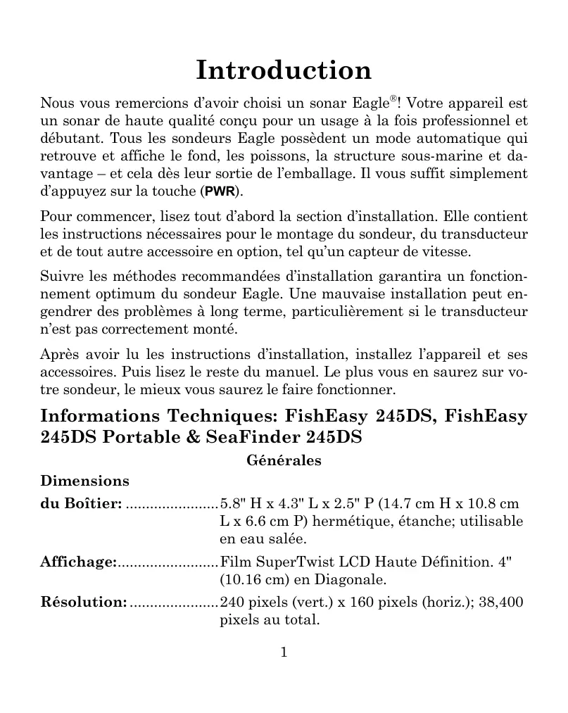 Introduction Nous vous remercions d’avoir choisi un sonar Eagle! Votre appareil est un sonar de haute qualité conçu pour un usage à la fois professionnel et débutant. Tous les sondeurs Eagle possèdent un mode automatique qui retrouve et affiche le fond, les poissons, la structure sous-marine et davantage – et cela dès leur sortie de l’emballage. Il vous suffit simplement d’appuyez sur la touche (PWR). Pour commencer, lisez tout d’abord la section d’installation. Elle contient les instructions nécessaires pour le montage du sondeur, du transducteur et de tout autre accessoire en option, tel qu’un capteur de vitesse. Suivre les méthodes recommandées d’installation garantira un fonctionnement optimum du sondeur Eagle. Une mauvaise installation peut engendrer des problèmes à long terme, particulièrement si le transducteur n’est pas correctement monté. Après avoir lu les instructions d’installation, installez l’appareil et ses accessoires. Puis lisez le reste du manuel. Le plus vous en saurez sur votre sondeur, le mieux vous saurez le faire fonctionner. Informations Techniques: FishEasy 245DS, FishEasy 245DS Portable & SeaFinder 245DS Générales Dimensions du Boîtier: .......................5.8" H x 4.3" L x 2.5" P (14.7 cm H x 10.8 cm L x 6.6 cm P) hermétique, étanche; utilisable en eau salée. Affichage:.........................Film SuperTwist LCD Haute Définition. 4" (10.16 cm) en Diagonale. Résolution: ......................240 pixels (vert.) x 160 pixels (horiz.); 38,400 pixels au total.