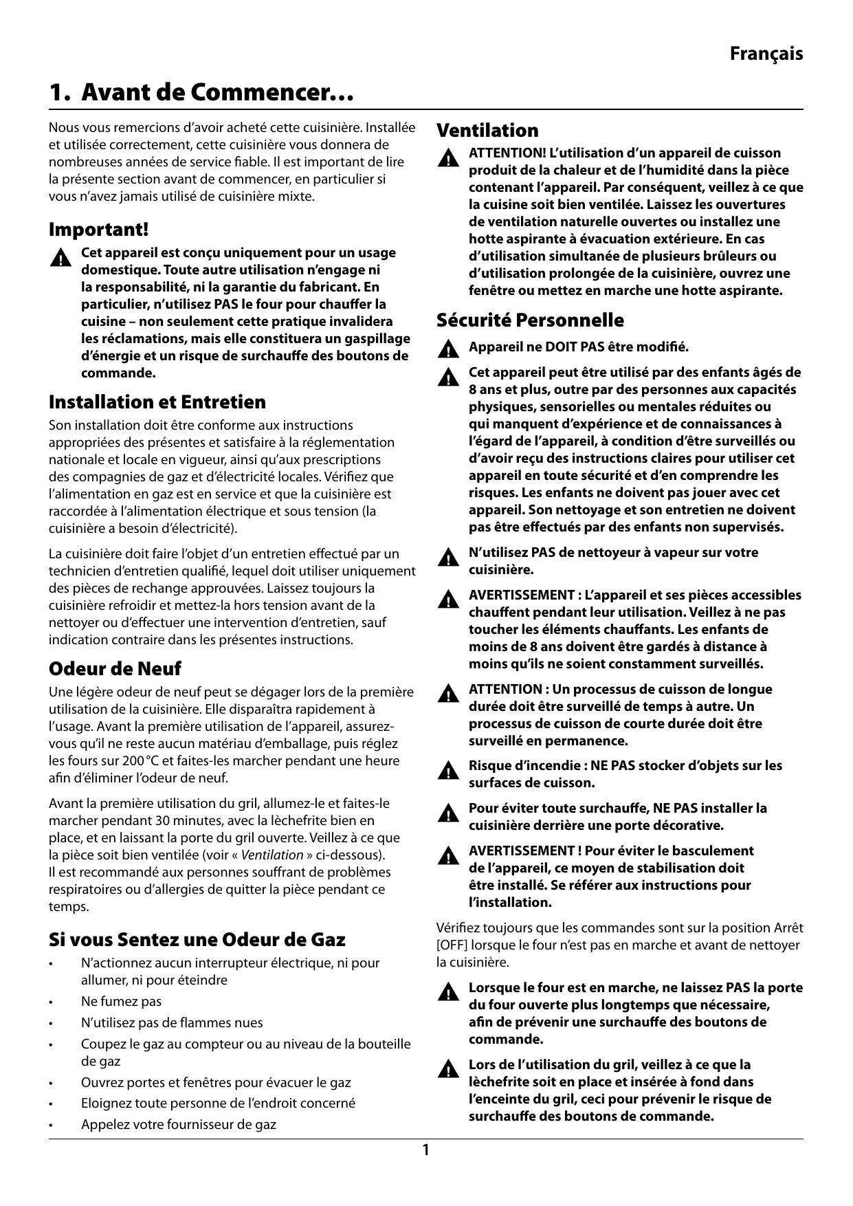 Français Nous vous remercions d'avoir acheté cette cuisinière. Installée et utilisée correctement, cette cuisinière vous donnera de nombreuses années de service fiable. Il est important de lire la présente section avant de commencer, en particulier si vous n'avez jamais utilisé de cuisinière mixte. Important! Cet appareil est conçu uniquement pour un usage domestique. Toute autre utilisation n'engage ni la responsabilité, ni la garantie du fabricant. En particulier, n'utilisez PAS le four pour chauffer la cuisine - non seulement cette pratique invalidera les réclamations, mais elle constituera un gaspillage d'énergie et un risque de surchauffe des boutons de commande. Installation et Entretien Son installation doit être conforme aux instructions appropriées des présentes et satisfaire à la réglementation nationale et locale en vigueur, ainsi qu'aux prescriptions des compagnies de gaz et d'électricité locales. Vérifiez que l'alimentation en gaz est en service et que la cuisinière est raccordée à l'alimentation électrique et sous tension (la cuisinière a besoin d'électricité). La cuisinière doit faire l'objet d'un entretien effectué par un technicien d'entretien qualifié, lequel doit utiliser uniquement des pièces de rechange approuvées. Laissez toujours la cuisinière refroidir et mettez-la hors tension avant de la nettoyer ou d'effectuer une intervention d'entretien, sauf indication contraire dans les présentes instructions. Odeur de Neuf Une légère odeur de neuf peut se dégager lors de la première utilisation de la cuisinière. Elle disparaîtra rapidement à l'usage. Avant la première utilisation de l'appareil, assurez- vous qu'il ne reste aucun matériau d'emballage, puis réglez les fours sur 200 °C et faites-les marcher pendant une heure afin d'éliminer l'odeur de neuf. Avant la première utilisation du gril, allumez-le et faites-le marcher pendant 30 minutes, avec la lèchefrite bien en place, et en laissant la porte du gril ouverte. Veillez à ce que la pièce soit bien ventilée (voir « Ventilation » ci-dessous). Ilest recommandé aux personnes souffrant de problèmes respiratoires ou d'allergies de quitter la pièce pendant ce temps. Si vous Sentez une Odeur de Gaz . N'actionnez aucun interrupteur électrique, ni pour allumer, ni pour éteindre . Ne fumez pas . N'utilisez pas de flammes nues . Coupez le gaz au compteur ou au niveau de la bouteille de gaz . Ouvrez portes et fenêtres pour évacuer le gaz . Eloignez toute personne de l'endroit concerné . Appelez votre fournisseur de gaz Ventilation À ATTENTION! L'utilisation d’un appareil de cuisson produit de la chaleur et de l'humidité dans la pièce contenant l'appareil. Par conséquent, veillez à ce que la cuisine soit bien ventilée. Laissez les ouvertures de venti n naturelle ouvertes ou installez une hotte aspirante à évacuation extérieure. En cas d'utilisation simultanée de plusieurs brûleurs ou d'utilisation prolongée de la cuisinière, ouvrez une fenêtre ou mettez en marche une hotte aspirante. Sécurité Personnelle À Appareil ne DOIT PAS être modifié. Cet appareil peut être utilisé par des enfants âgés de 8 ans et plus, outre par des personnes aux capacités physiques, sensorielles ou mentales réduites ou qui manquent d'expérience et de connaissances à l'égard de l’appareil, à condition d'être surveillés ou d’avoir reçu des instructions claires pour utiliser cet appareil en toute sécurité et d'en comprendre les risques. Les enfants ne doivent pas jouer avec cet appareil. Son nettoyage et son entretien ne doivent pas être effectués par des enfants non supervisés. À AVERTISSEMENT : L'appareil et ses pièces accessibles chauffent pendant leur utilisation. Veillez à ne pas toucher les éléments chauffants. Les enfants de moins de 8 ans doivent être gardés à distance à moins qu'ils ne soient constamment surveillés. À ATTENTION : Un processus de cuisson de longue durée doit être surveillé de temps à autre. Un processus de cuisson de courte durée doit être surveillé en permanence. Risque d'incendie : NE PAS stocker d'objets sur les surfaces de cuisson. Pour éviter toute surchauffe, NE PAS installer la cuisinière derrière une porte décorative. À AVERTISSEMENT ! Pour éviter le basculement de l'appareil, ce moyen de stabilisation doit être installé. Se référer aux instructions pour l'installation. Vérifiez toujours que les commandes sont sur la position Arrêt [OFF] lorsque le four n'est pas en marche et avant de nettoyer la cuisinière. Lorsque le four est en marche, ne laissez PAS la porte du four ouverte plus longtemps que nécessaire, afin de prévenir une surchauffe des boutons de commande. Lors de l'utilisation du gril, veillez à ce que la lèchefrite soit en place et insérée à fond dans l'enceinte du gril, ceci pour prévenir le risque de surchauffe des boutons de commande.