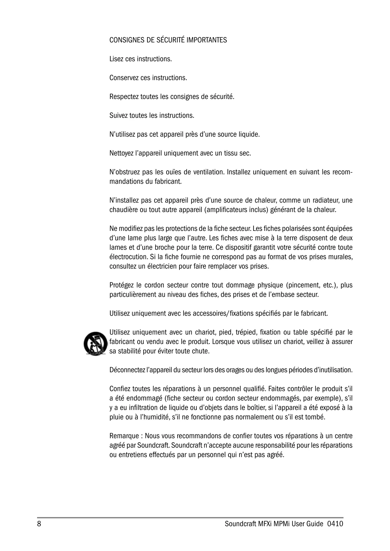 Lisez ces instructions. Conservez ces instructions. Respectez toutes les consignes de sécurité. Suivez toutes les instructions. N'utilisez pas cet appareil près d'une source liquide. Nettoyez l'appareil uniquement avec un tissu sec. N'obstruez pas les ouïes de ventilation. Installez uniquement en suivant les recom- mandations du fabricant. N'installez pas cet appareil près d'une source de chaleur, comme un radiateur, une chaudière ou tout autre appareil (amplificateurs inclus) générant de la chaleur. Ne modifiez pas les protections de la fiche secteur. Les fiches polarisées sont équipées d'une lame plus large que l’autre. Les fiches avec mise à la terre disposent de deux lames et d'une broche pour la terre. Ce dispositif garantit votre sécurité contre toute électrocution. Si la fiche fournie ne correspond pas au format de vos prises murales, consultez un électricien pour faire remplacer vos prises. Protégez le cordon secteur contre tout dommage physique (pincement, etc.), plus particulièrement au niveau des fiches, des prises et de l'embase secteur. Utilisez uniquement avec les accessoires/fixations spécifiés par le fabricant. Utilisez uniquement avec un chariot, pied, trépied, fixation ou table spécifié par le fabricant ou vendu avec le produit. Lorsque vous utilisez un chariot, veillez à assurer sa stabilité pour éviter toute chute. Déconnectez l'appareil du secteur lors des orages ou des longues périodes d’inutilisation. Confiez toutes les réparations à un personnel qualifié. Faites contrôler le produit s’il a été endommagé (fiche secteur ou cordon secteur endommagés, par exemple), s'il yaeu infiltration de liquide ou d'objets dans le boîtier, si l'appareil a été exposé à la pluie ou à l'humidité, s'il ne fonctionne pas normalement ou s’il est tombé. Remarque : Nous vous recommandons de confier toutes vos réparations à un centre agréé par Soundcraft. Soundcraft n'accepte aucune responsabilité pour les réparations ou entretiens effectués par un personnel qui n'est pas agréé. Soundcraft MFXi MPMi User Guide 0410