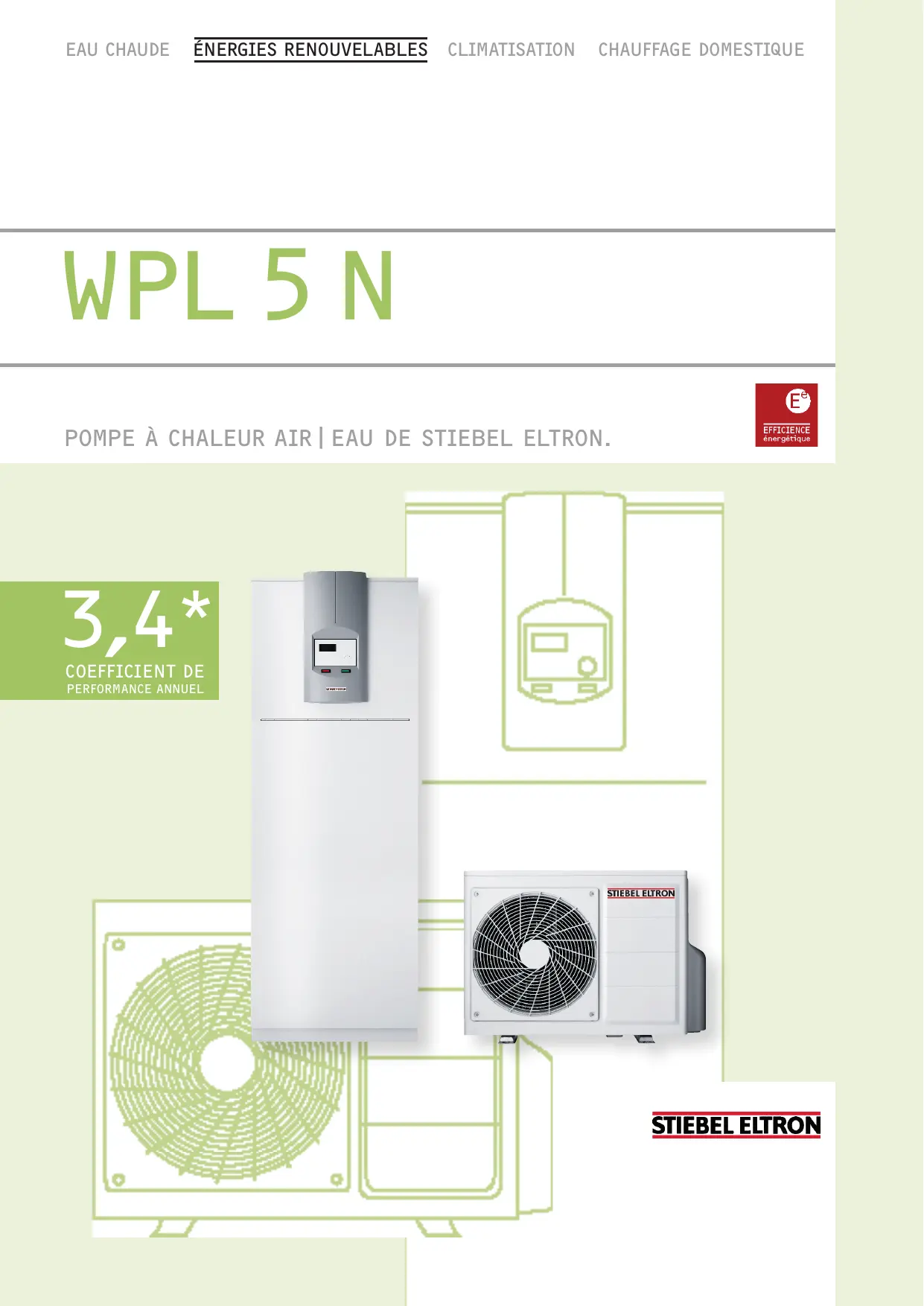CHAUFFAGE DOMESTIQUE WPL 5 N POMPE À CHALEUR AIR | EAU de STIEBEL ELTRON. 3,4 * Coefficient de performance annuel Pompe à chaleur WPL 5 N. Plus d’air = plus d’économies d’énergie Tout propriétaire de maisons ou appartements souhaite profiter de son indépendance. Une attente que la pompe à chaleur WPL 5 N satisfait avec brio à plusieurs niveaux. Pour le chauffage, elle utilise par exemple l’énergie solaire contenue dans l’air et réduit ainsi les coûts énergétiques. Dans les ensembles résidentiels, elle permet d’alimenter en chaleur chaque unité qui règlera exactement sa consommation individuelle. Extrêmement silencieuse et reposant sur une technique ne générant aucune émission, elle fournit toute une pléiade de libertés dans le domaine résidentiel. La WPL 5 N garantit dans tous les cas une technique prometteuse. Appareil compact – alimentation complète | La pompe à chaleur WPL 5 N est le système complet pour le chauffage de bâtiments à faible consommation d’énergie dont le besoin en eau chaude est élevé. Sans installation compliquée, elle chauffe les appartements de manière efficace à l’aide d’un appareil extérieur. Le circulateur intégré géré par le gestionnaire de la pompe à chaleur, la résistance additionnelle intégrée et l’accumulateur d’eau chaude de 200 litres sont les principaux groupes intégrés en série dans cet appareil compact. Chauffage individuel | En raison de sa forme compacte, la WPL 5 N est prédestinée pour l’utilisation dans des appartements en propriété. En effet, d’une part, grâce à l’alimentation en chaleur décentralisée, elle supprime les pertes de chaleur considérables résultant de la répartition de chaleur dans différents appartements. D’autre part, chaque utilisateur paie exactement sa consommation individuelle relevée sur le compteur électrique. La pompe à chaleur WPL 5 N qui fonctionne de manière particulièrement discrète compte d’ailleurs parmi les appareils les plus silencieux actuellement disponibles sur le marché. Aperçu des avantages Efficience énergétique Utilise jusqu’à 70 % de l’énergie solaire contenue dans l’air Optimisation des coûts Réduit de moitié les coûts de chauffage Environnement Fonctionne sans générer des émissions, fluide frigorigène neutre pour l’environnement Propriétés d’utilisation Offre un confort d’eau chaude élevé Solutions puissantes pour le domaine résidentiel. Puissance fois 3,4* | Avec la WPL 5 N, STIEBEL ELTRON ouvre de nouvelles voies. L’entreprise pose en effet de nouveaux jalons en proposant l’une des premières pompes à chaleur fonctionnant avec le fluide frigorigène naturel CO2: STIEBEL ELTRON a réussi à parfaitement exploiter le potentiel de cette technique grâce à l’harmonisation optimale de l’échauffement de l’eau de chauffage et de l’eau potable. La technologie des compresseurs Inverter permet par ailleurs d’adapter de manière optimale la puissance au besoin respectif et d’obtenir un coefficient de performance annuel de 3,4*. Finalement, grâce à son fonctionnement très silencieux et son mélange spécifique d’une quantité minime de chauffage et d’un pourcentage plus élevé d’eau chaude, ce système se prête de manière idéale à des installations dans des encombrements réduits. Une solution parfaite garantie | STIEBEL ELTRON livre une qualité certifiée, non seulement dans le cadre de la garantie bisannuelle, mais surtout grâce aux contrats de service après-vente optionnels incluant l’entretien et à une prolongation de la garantie jusqu’à sept ans. Avec les aides à la planification globales et le service de mise en service, STIEBEL ELTRON propose les meilleures conditions pour un service complet au profit d’une alimentation en chaleur garantie pour l’avenir. WPL 5 N Fonctionnement très silencieux Température de l’eau chaude jusqu’à + 70 °C Modèle optimal pour le neuf et les encombrements réduits Adaptation optimale de la puissance par utilisation de 2 compresseurs Inverter Installation simple Limite d’utilisation de – 20 °C à + 30 °C température extérieure Fluide frigorigène naturel CO2 Accumulateur d’eau chaude: 200 litres Aperçu des données techniques WPL 5 N Réf. code
