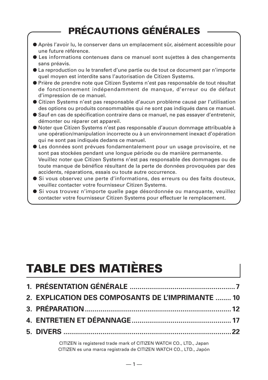 ● Après l’avoir lu, le conserver dans un emplacement sûr, aisément accessible pour une future référence. ● Les informations contenues dans ce manuel sont sujettes à des changements sans préavis. ● La reproduction ou le transfert d’une partie ou de tout ce document par n’importe quel moyen est interdite sans l’autorisation de Citizen Systems. ● Prière de prendre note que Citizen Systems n’est pas responsable de tout résultat de fonctionnement indépendamment de manque, d’erreur ou de défaut d’impression de ce manuel. ● Citizen Systems n’est pas responsable d’aucun problème causé par l’utilisation des options ou produits consommables qui ne sont pas indiqués dans ce manuel. ● Sauf en cas de spécification contraire dans ce manuel, ne pas essayer d’entretenir, démonter ou réparer cet appareil. ● Noter que Citizen Systems n’est pas responsable d’aucun dommage attribuable à une opération/manipulation incorrecte ou à un environnement inexact d’opération qui ne sont pas indiqués dedans ce manuel. ● Les données sont prévues fondamentalement pour un usage provisoire, et ne sont pas stockées pendant une longue période ou de manière permanente. Veuillez noter que Citizen Systems n’est pas responsable des dommages ou de toute manque de bénéfice résultant de la perte de données provoquées par des accidents, réparations, essais ou toute autre occurrence. ● Si vous observez une perte d’informations, des erreurs ou des faits douteux, veuillez contacter votre fournisseur Citizen Systems. ● Si vous trouvez n’importe quelle page désordonnée ou manquante, veuillez contacter votre fournisseur Citizen Systems pour effectuer le remplacement. PRÉCAUTIONS DE SÉCURITÉ ... QUI DEVRAIENT ÊTRE OBSERVÉES RIGOUREUSEMENT Veuillez lire attentivement ces PRÉCAUTIONS DE SÉCURITÉ avant d’utiliser l’appareil pour la première fois. La manipulation incorrecte peut avoir comme conséquence des accidents (incendie, décharge électrique ou blessures). Afin d'éviter des blessures aux opérateurs, tiers, ou des dommages à la propriété, des symboles d'avertissement spéciaux sont utilisés dans le Mode d’Emploi pour indiquer les items importants à observer rigoureusement. ● Après avoir lu ce mode d’emploi, conservez-le dans un endroit sûr et facilement accessible pour référence ultérieure. ● Certaines des descriptions contenues dans ce mode d’emploi peuvent ne pas s’appliquer à certains modèles d’imprimantes. Ce qui suit indique le degré de danger et de dommage encouru si l’imprimante n’est pas utilisée correctement, sans tenir compte des instructions indiquées par les symboles d’avertissement. AVERTISSEMENT Le non-respect des précautions indiquées par ce symbole peut provoquer des blessures mortelles ou graves. ATTENTION Le non-respect des précautions indiquées par ce symbole peut provoquer des blessures ou des dommages matériels. Ce symbole sert à attirer votre attention sur des points importants. Ce symbole sert à vous avertir d’un risque d’électrocution ou de dommage électrostatique. Ce symbole indique la nécessité de débrancher l’imprimante de la prise murale. Ce symbole est utilisé pour indiquer l'information utile, telle que procédures, instructions ou autres données dans ce genre. Ce symbole sert à indiquer des actions interdites. —2— AVERTISSEMENT ■ N’utilisez pas et ne rangez pas cet appareil dans un endroit où il sera exposé à :