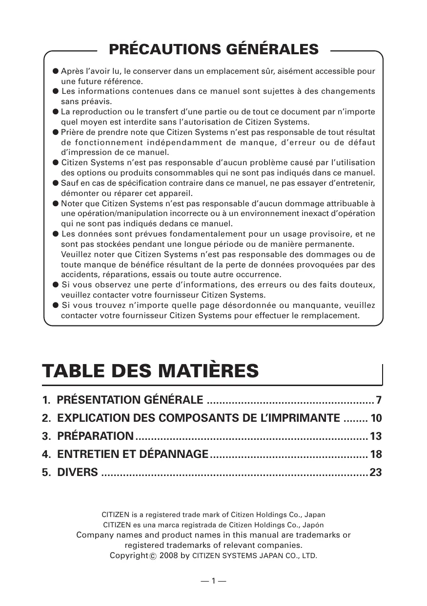 © Après l'avoir lu, le conserver dans un emplacement sûr, aisément accessible pour une future référence. © Les informations contenues dans ce manuel sont sujettes à des changements sans préavis. © La reproduction ou le transfert d'une partie ou de tout ce document par n'importe quel moyen est interdite sans l'autorisation de Citizen Systems. @ Prière de prendre note que Citizen Systems n'est pas responsable de tout résultat de fonctionnement indépendamment de manque, d'erreur ou de défaut d'impression de ce manuel. © Citizen Systems n’est pas responsable d'aucun problème causé par l’utilisation des options ou produits consommables qui ne sont pas indiqués dans ce manuel. © Sauf en cas de spécification contraire dans ce manuel, ne pas essayer d'entretenir, démonter ou réparer cet appareil. © Noter que Citizen Systems n'est pas responsable d'aucun dommage attribuable à une opération/manipulation incorrecte ou à un environnement inexact d'opération qui ne sont pas indiqués dedans ce manuel. @ Les données sont prévues fondamentalement pour un usage provisoire, et ne sont pas stockées pendant une longue période ou de manière permanente. Veuillez noter que Citizen Systems n'est pas responsable des dommages où de toute manque de bénéfice résultant de la perte de données provoquées par des accidents, réparations, essais ou toute autre occurrence. © Si vous observez une perte d'informations, des erreurs ou des faits douteux, veuillez contacter votre fournisseur Citizen Systems. © Si vous trouvez n'importe quelle page désordonnée où manquante, veuillez contacter votre fournisseur Citizen Systems pour effectuer le remplacement.