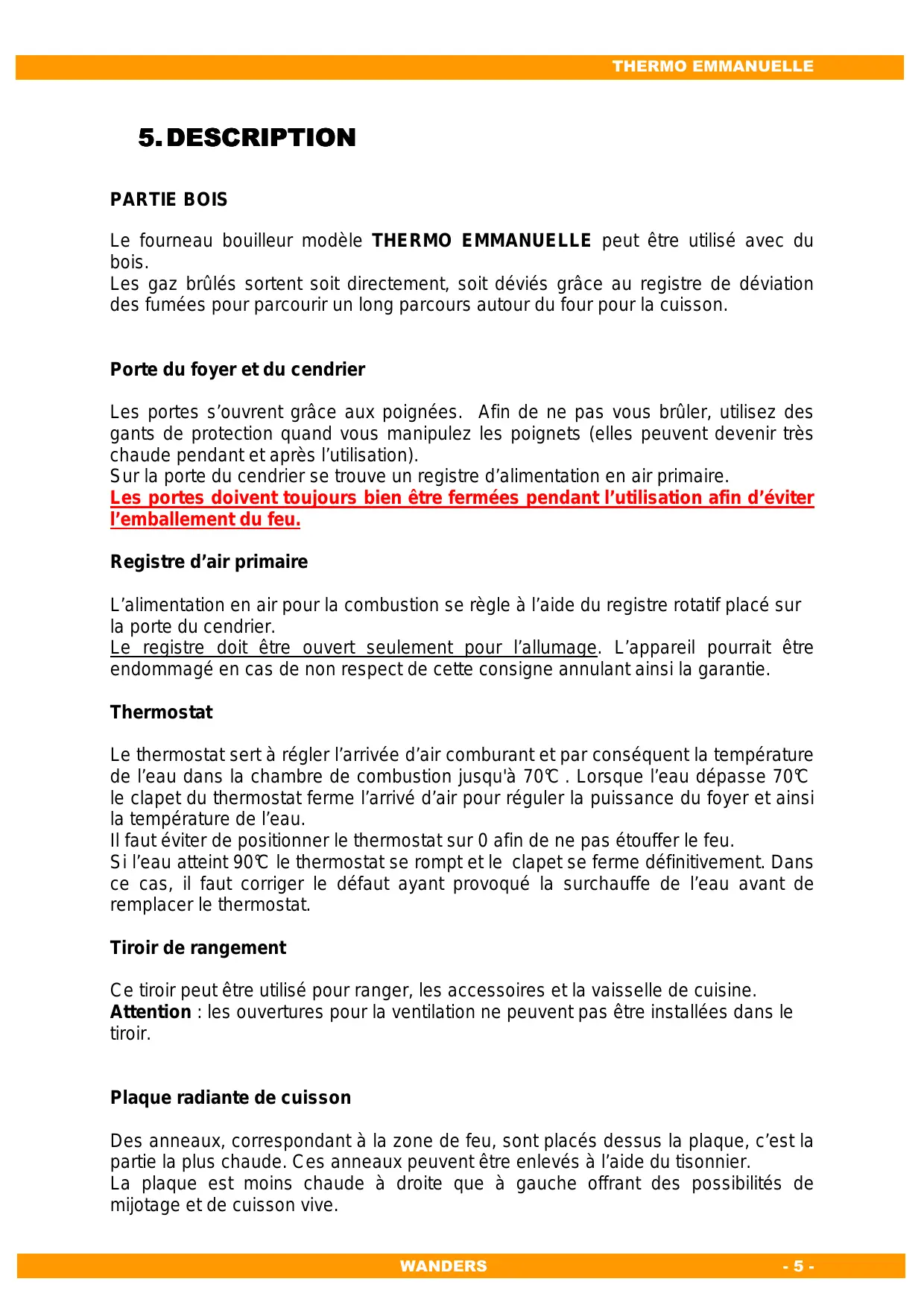 DESCRIPTION PARTIE BOIS Le fourneau bouilleur modèle THERMO EMMANUELLE peut être utilisé avec du bois. Les gaz brûlés sortent soit directement, soit déviés grâce au registre de déviation des fumées pour parcourir un long parcours autour du four pour la cuisson. Porte du foyer et du cendrier Les portes s’ouvrent grâce aux poignées. Afin de ne pas vous brûler, utilisez des gants de protection quand vous manipulez les poignets (elles peuvent devenir très chaude pendant et après l’utilisation). Sur la porte du cendrier se trouve un registre d’alimentation en air primaire. Les portes doivent toujours bien être fermées pendant l’utilisation afin d’éviter l’emballement du feu. Registre d’air primaire L’alimentation en air pour la combustion se règle à l’aide du registre rotatif placé sur la porte du cendrier. Le registre doit être ouvert seulement pour l’allumage. L’appareil pourrait être endommagé en cas de non respect de cette consigne annulant ainsi la garantie. Thermostat Le thermostat sert à régler l’arrivée d’air comburant et par conséquent la température de l’eau dans la chambre de combustion jusqu'à 70°C . Lorsque l’eau dépasse 70°C le clapet du thermostat ferme l’arrivé d’air pour réguler la puissance du foyer et ainsi la température de l’eau. Il faut éviter de positionner le thermostat sur 0 afin de ne pas étouffer le feu. Si l’eau atteint 90°C le thermostat se rompt et le clapet se ferme définitivement. Dans ce cas, il faut corriger le défaut ayant provoqué la surchauffe de l’eau avant de remplacer le thermostat. Tiroir de rangement Ce tiroir peut être utilisé pour ranger, les accessoires et la vaisselle de cuisine. Attention : les ouvertures pour la ventilation ne peuvent pas être installées dans le tiroir. Plaque radiante de cuisson Des anneaux, correspondant à la zone de feu, sont placés dessus la plaque, c’est la partie la plus chaude. Ces anneaux peuvent être enlevés à l’aide du tisonnier. La plaque est moins chaude à droite que à gauche offrant des possibilités de mijotage et de cuisson vive. WANDERS