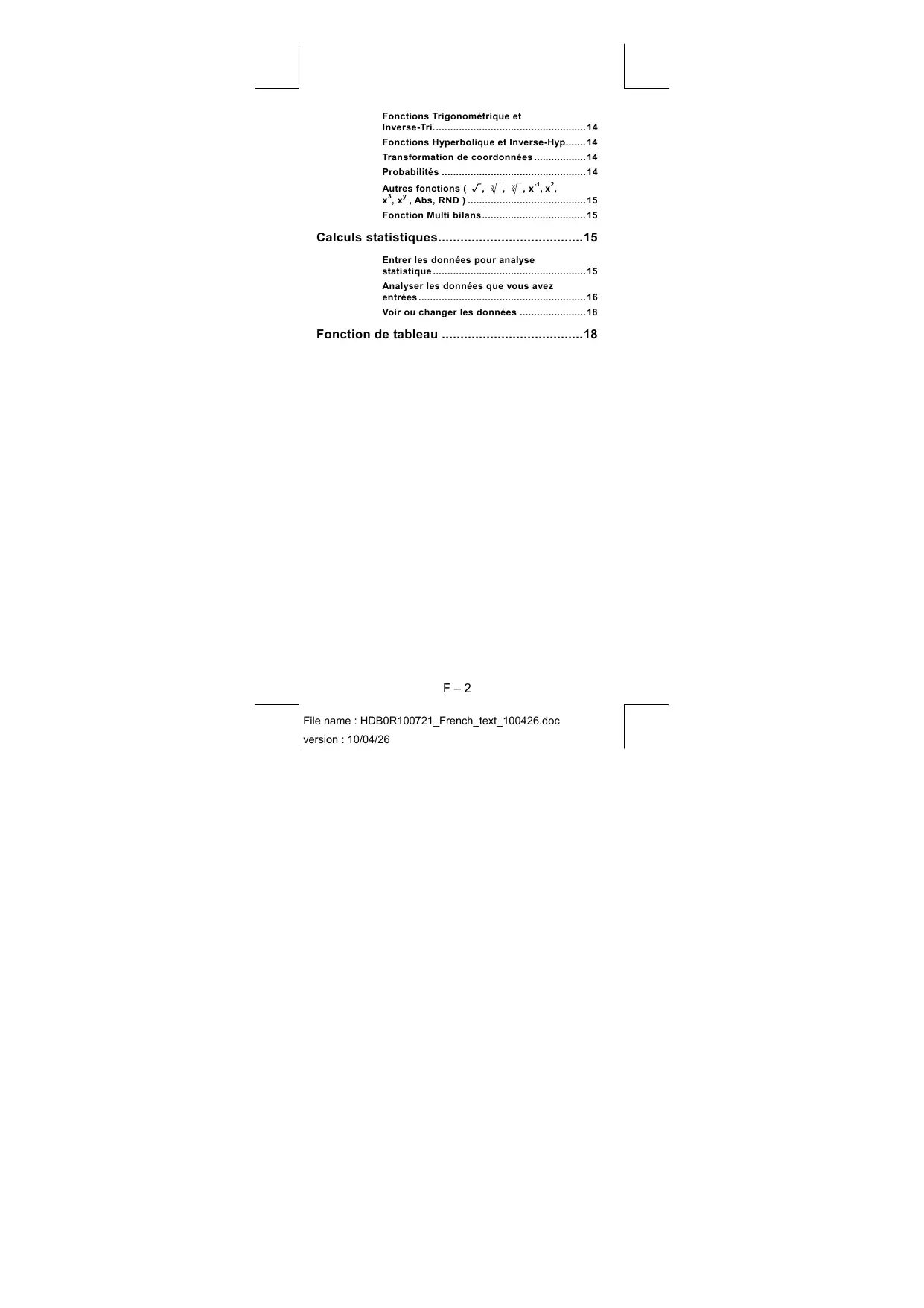 Les nombres utilisés comme entrée doivent être compris dans le champ de la fonction donnée comme suit: Fonctions sin x cos x tan x Champ d’entrée x < 9 x 10 9 Rad : 0 ≦ x < 157079632.7 Grad : 0 ≦ x < 1 x 10 Deg : 0 ≦ Comme sin x, sauf quand 0 ≦ x ≦ 69 ( x est une intégrale) 0 ≦ r ≦ n, 0 ≦ n< 1 x 10 (n,r sont des integrales) 1 ≦ {n!/(n-r)!} < 1 x10 0 ≦ r ≦ n, 0 ≦ n < 1 x 10 10 (n,r sont des integrales) ou 1≦{n!/(n-r)!} <1 x 10 100 1≦n!/r!<1 x10 R P x , y < 1 x 10 100