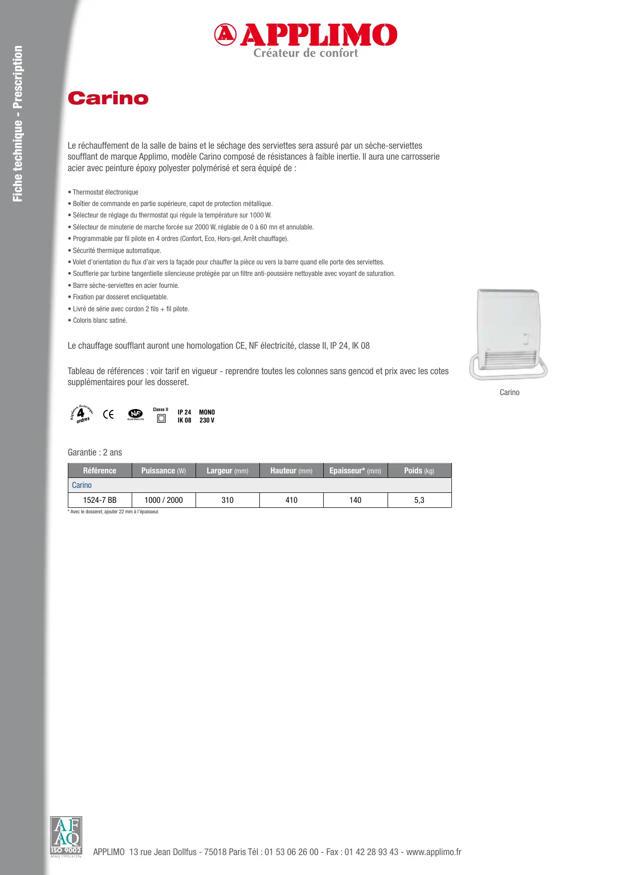 Fiche technique - Prescription Carino Le réchauffement de la salle de bains et le séchage des serviettes sera assuré par un sèche-serviettes soufflant de marque Applimo, modèle Carino composé de résistances à faible inertie. Il aura une carrosserie acier avec peinture époxy polyester polymérisé et sera équipé de :