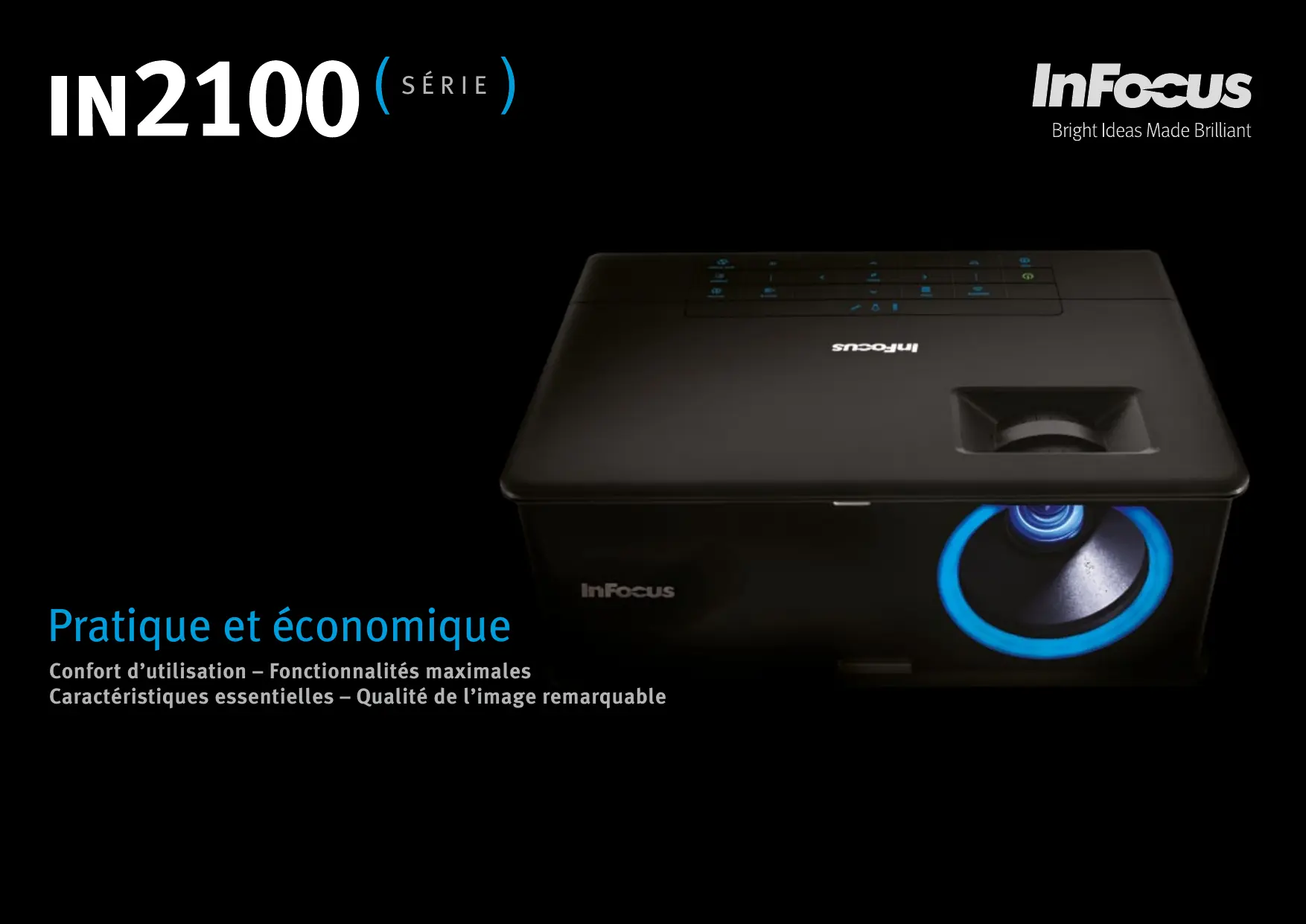 Pratique le grand écran au quotidien. La nouvelle série IN2100 est à la fois pratique et économique. Disposant de multiples options de connections, c'est la première gamme de produit InFocus à offrir une connexion réseau à prix abordable, en plus du LitePortTM - pourprésenter sans PC -, d'entrées VGA multiples et d'entrées audio attribuables. La série IN2100 propose une luminosité de 3000 lumens, ou 2400 en mode Éco. Elle accepte les résolutions jusqu'àu WUXGA (1920 x 1200) et s'appuie sur la technologie DLP® couplée au calibrage BrilliantColorTM d'InFocus, pour une qualité d'image inégalée. Les IN2100 sont également équipés de série de l'anneau lumineux « Blue Iris » qui permet aux utilisateurs de savoir quand le projecteur s'allume ou s'éteint. Voyez grand où que vous soyez avec la nouvelle série IN2100.