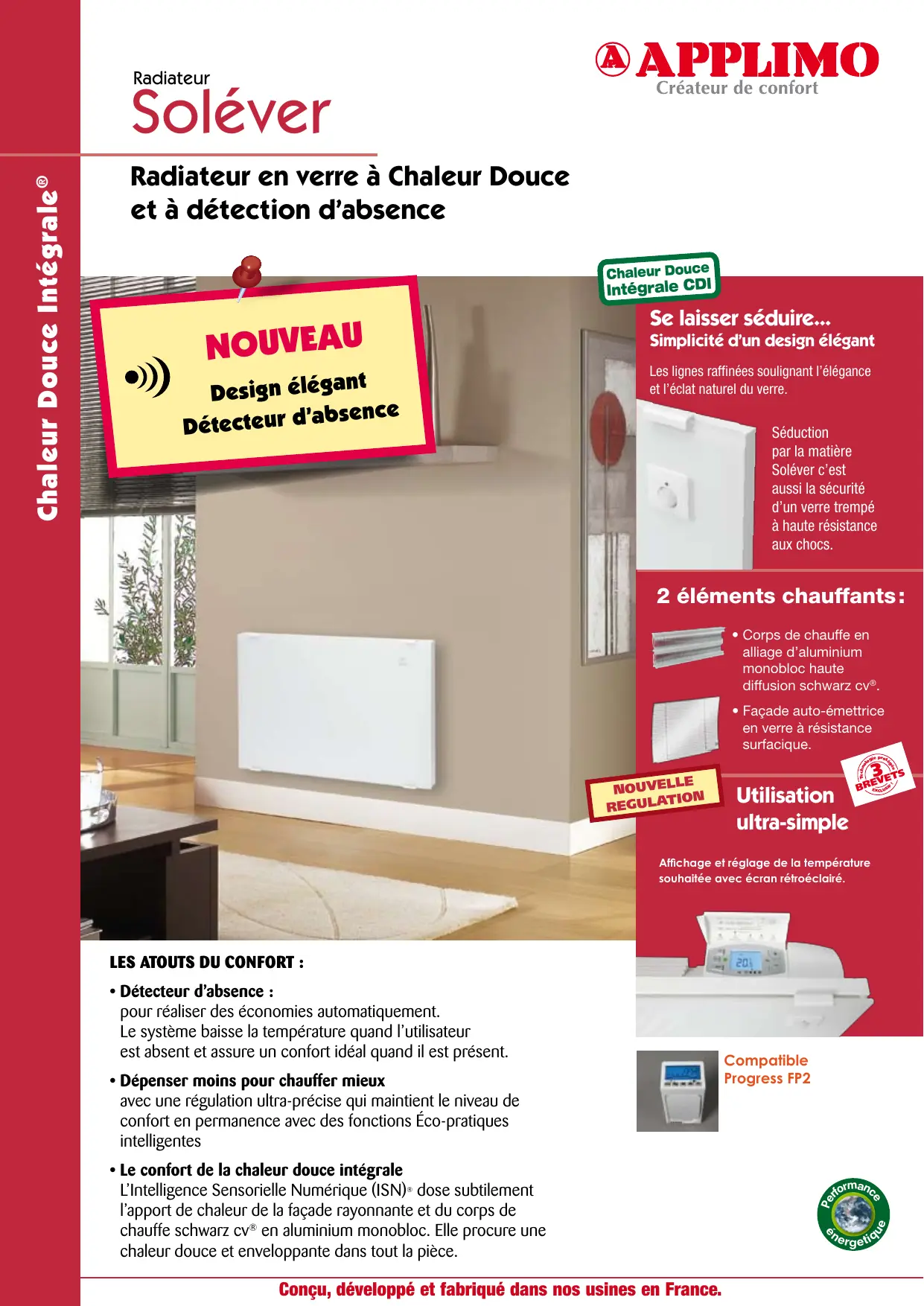 Design éléga bsence Détecteur d’a Se laisser séduire... Simplicité d’un design élégant Les lignes raffinées soulignant l’élégance et l’éclat naturel du verre. Séduction par la matière Soléver c’est aussi la sécurité d’un verre trempé à haute résistance aux chocs. 2 éléments chauffants :