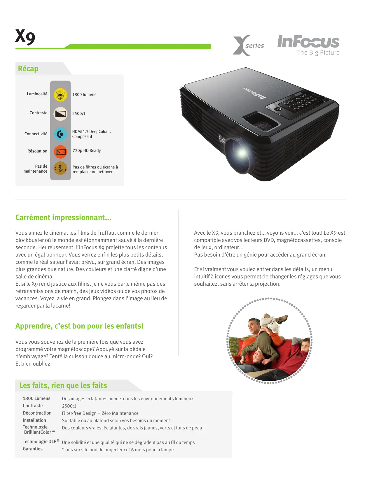 Vous aimez le cinéma, les films de Truffaut comme le dernier blockbuster où le monde est éttonnamment sauvé à la première seconde. Heureusement, l'InFocus X9 projette tous les contenus avec un égal bonheur. Vous verrez enfin les plus petits détails, comme le réalisateur l'avait prévu, sur grand écran. Des images plus grandes que nature. Des couleurs et une clarté digne d'une salle de cinéma.