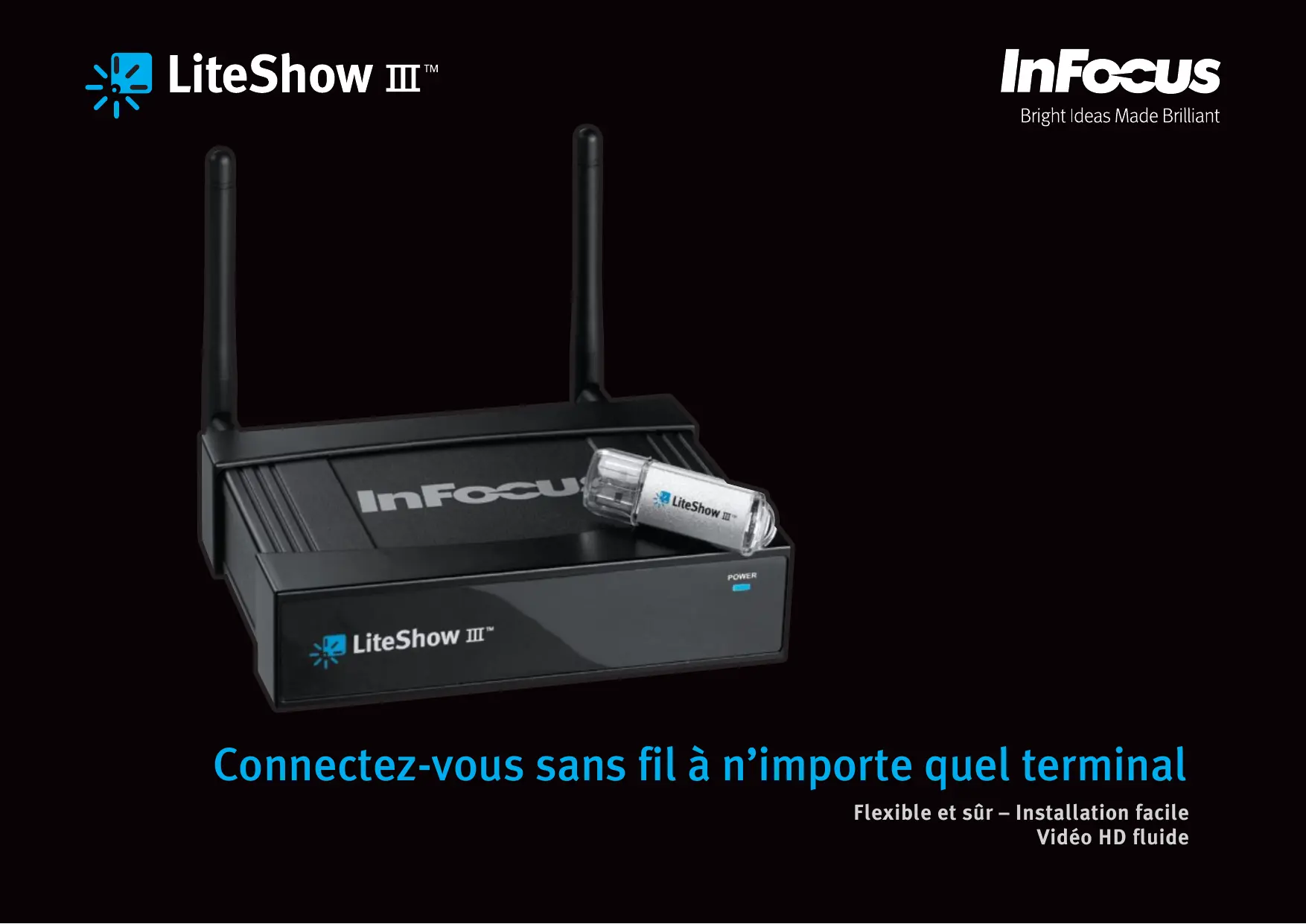 Connectez-vous sans fil à n’importe quel terminal Flexible et sûr – Installation facile Vidéo HD fluide Connectez-vous, projetez et collaborez… sans fil Il vous suffit d’associer le LiteShow III™ d’InFocus à n’importe quel projecteur ou terminal d’affichage pour partager facilement et rapidement vos données, ainsi que vos fichiers audio ou vidéo, via une connexion wifi sécurisée. Le LiteShow III est compatible avec les tous derniers systèmes d’exploitation, y compris Windows 7, Mac, iPhone et Windows Mobile, et sa vitesse de transmission s’élève jusqu’à 150 Mbps. Le LiteShow III facilite le travail d’équipe. Les outils Modérateur et Quadrivue permettent à de nombreux ordinateurs de se connecter simultanément au terminal d’affichage, tout en vous laissant choisir lequel ou lesquels sont effectivement projetés ou affichés. Connectez le LiteShow III à votre réseau pour créer un nouveau point d’accès sécurisé. Les multiples niveaux de sécurité vous permettent de décider si les utilisateurs doivent bénéficier d’un accès sans restriction au réseau, d’un accès à Internet ou d’aucun (présentation uniquement). Cette simple connexion vous permet de présenter sans fil et de créer un nouveau point d’accès au réseau Une connexion wifi rapide et pratique Grande vitesse et longue portée La technologie wifi 802.11n permet au LiteShow III d’atteindre une vitesse de transfert de 150 Mbps pour une portée allant jusqu’à 91 m. Vidéo fluide Le LiteShow III bénéficie d’un décodage vidéo intégré, ce qui lui permet d’opérer le lissage des données vidéo au lieu de l’ordinateur émetteur. La reproduction de la vidéo et de l’audio est en conséquence rapide et fluide, même avec des hautes résolutions ou des ordinateurs plus anciens dotés de processeurs moins puissants. Pourquoi choisir le LiteShow III ? Transformez n’importe quel terminal d’affichage pourvu d’une entrée VGA en un terminal wifi et / ou réseau Connectez et affichez les écrans de plusieurs ordinateurs grâce aux outils de collaboration Modérateur et Quadrivue 802.11n pour une transmission ultra-rapide des données, de l’audio et de la vidéo Le décodage vidéo intégré permet l’affichage fluide de la vidéo HD Créé un point d’accès sécurisé au réseau wifi Une connexion rapide Il suffit aux visiteurs désireux de se connecter au LiteShow III d’insérer la clé USB LiteShow III avant de commencer leur présentation. Ils n’auront pas besoin de solliciter les talents ou droits de votre administrateur réseau, ni d’installer un logiciel au préalable. LiteShow III avec clé USB Des outils pour travailler en groupe Flexible et sûr Contrôler l’affichage de plusieurs ordinateurs Configurable pour s’adapter parfaitement à votre organisation Le Modérateur est une fonction clé puisqu’elle permet à tous les ordinateurs d’une salle de se connecter au terminal d’affichage, tout en donnant la possibilité à un « modérateur » de sélectionner le ou les écrans qui s’affichent, via une page web. Il est dès lors très facile de passer d’une présentation à l’autre. En classe, les professeurs peuvent par exemple afficher les écrans des ordinateurs portables de leurs étudiants à tour de rôle. Le LiteShow III est polyvalent et autorise aussi bien un affichage wifi simple qu’une configuration complète au sein d’un réseau complexe et hautement sécurisé. Cliquez sur l’ordinateur que vous souhaitez afficher Contrôle Play Adresse IP Le LiteShow III respecte vos standards en termes de sécurité, tout en proposant différentes options pour accéder au réseau ou à Internet. Il obéit aux derniers protocoles, y compris WPA2-PSK. Présentation wifi avec la configuration Point d’accès Le LiteShow III peut faire office de Point d’accès au réseau, ce qui permet à n’importe quel ordinateur -ou PDA- équipé wifi de présenter et/ou d’accéder aux ressources du réseau de l’entreprise, ou plus simplement à Internet. La fonction Gardien peut être activée pour bloquer tout accès (affichage uniquement), autoriser l’accès à Internet (affichage et accès à Internet) ou tout autoriser (affichage, Internet, accès au réseau de l’entreprise). Réseau principal (optionnel) Nom de l’ordinateur Plusieurs niveaux de sécurité Données projetées Sans fil Présentez via votre réseau De nombreux ordinateurs peuvent se connecter simultanément 4 affichages en 1 La fonction Quadrivue permet d’afficher simultanément jusqu’à quatre ordinateurs. Un atout pour les réunions à distance et les projets exigeant la participation de plusieurs intervenants (entreprise, classe). Câblé Changer de réseau wifi pour pouvoir présenter n’est plus une obligation. Vous pouvez désormais rester connecté au réseau de votre entreprise (email, dossiers partagés…) quand vous voulez présenter. Il vous suffit de vous connecter au LiteShow III comme vous vous connecteriez à une imprimante et de commencer votre présentation. De plus, il est possible de passer en mode Présentation réseau pour que les visiteurs puissent utiliser les fonctions wifi et Point d’accès afin de présenter et d’accéder à Internet, sans toutefois avoir accès à votre réseau. Réseau principal (optionnel) Choisissez quel ordinateur afficher grâce à une simple page web Données réseau Connexion limitée à l’affichage Point d’accès au réseau Restez connecté à votre réseau et présentez sans fil Données projetées Connectez-vous au projecteur via le réseau Sans fil Données réseau Câblé Caractéristiques* liteshow iii Connectivité