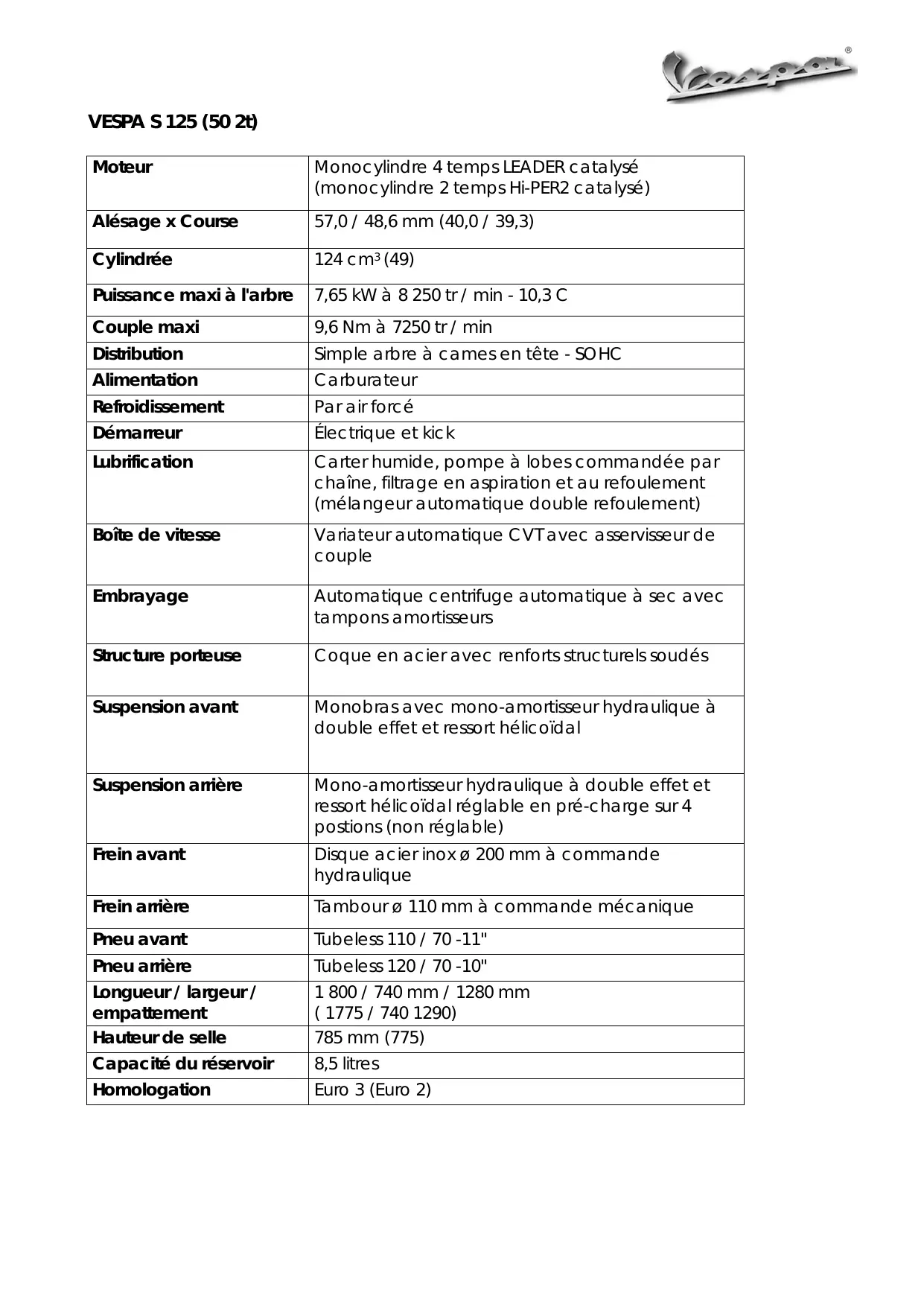 | Modèle | VESPA S 125 50 2T |
