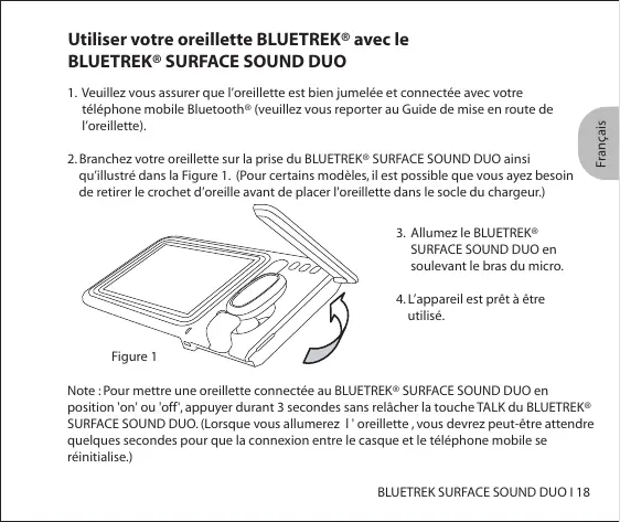utilisé. Figure 1 Note : Pour mettre une oreillette connectée au BLUETREK® SURFACE SOUND DUO en position 'on' ou 'off', appuyer durant 3 secondes sans relâcher la touche TALK du BLUETREK® SURFACE SOUND DUO. (Lorsque vous allumerez l ' oreillette , vous devrez peut-être attendre quelques secondes pour que la connexion entre le casque et le téléphone mobile se réinitialise.)