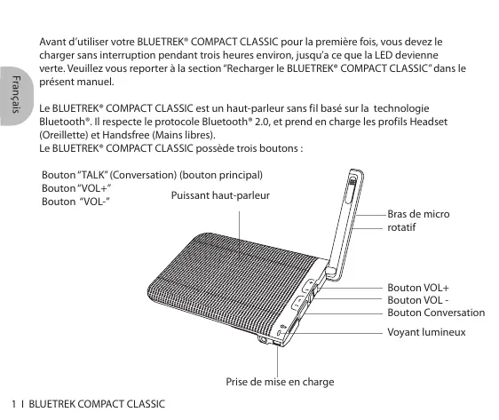 Avant d'utiliser votre BLUETREK® COMPACT CLASSIC pour la première fois, vousdezé le charger sans interruption pendant trois heures environ, jusqu'à ce que la LED devienne verte. Veuiliez vous reporter à la section "Recharger le BLUETREK® COMPACT CLASSIC" dans le present manuel.