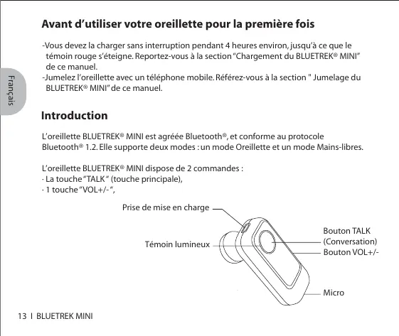 L'oreillette BLUETREK® MINI est agreée Bluetooth®, et conforme au protocole Bluetooth® 1.2. Elle supporte deux modes: un mode Oreillette et un mode Mains-libres.