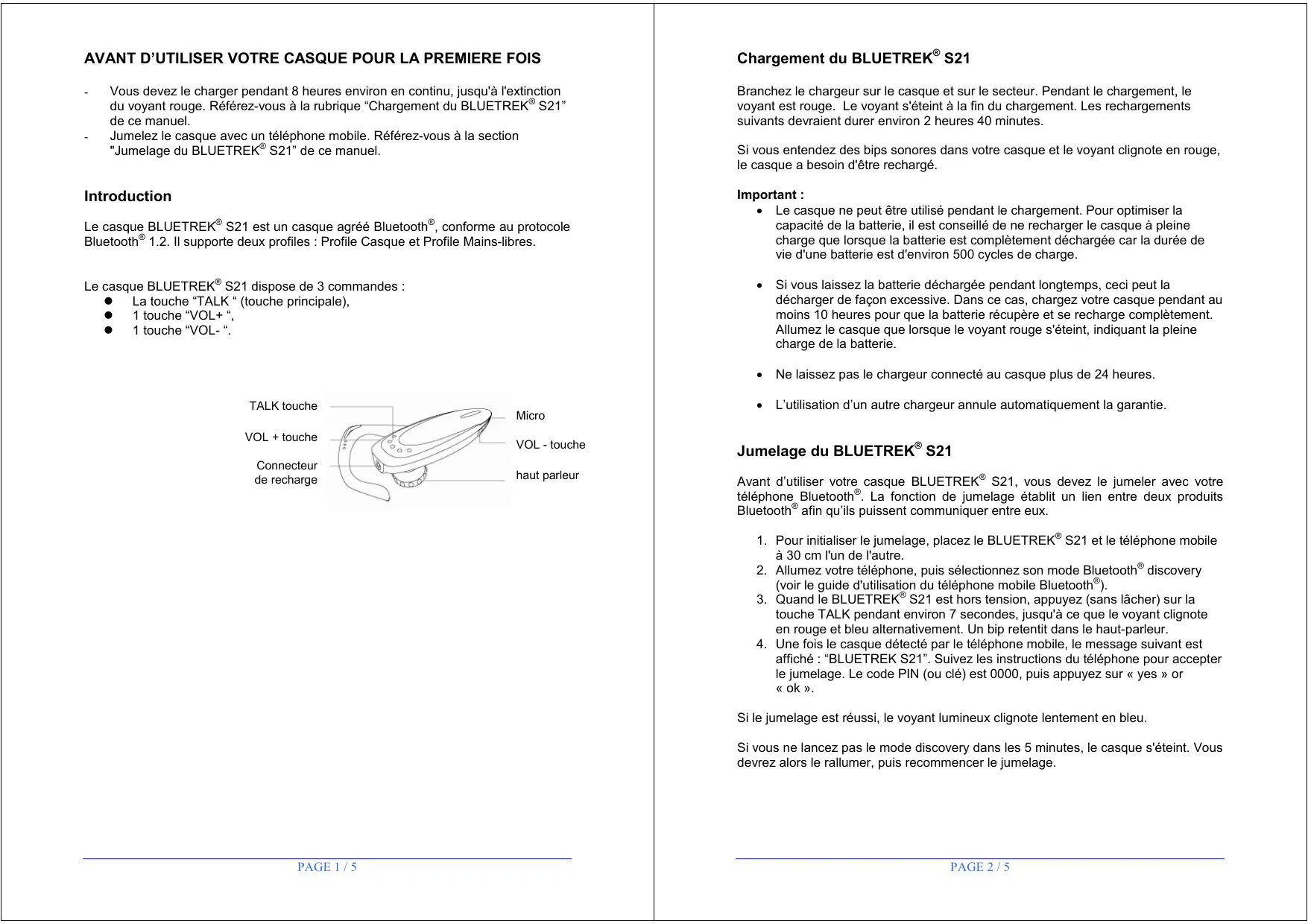 Vous devez le charger pendant 8 heures environ en continu, jusqu'à l'extinction du voyant rouge. Référez-vous à la rubrique “Chargement du BLUETREK® S21” de ce manuel. Jumelez le casque avec un téléphone mobile. Référez-vous à la section "Jumelage du BLUETREK® S21” de ce manuel. Introduction Le casque BLUETREK® S21 est un casque agréé Bluetooth®, conforme au protocole Bluetooth® 1.2. Il supporte deux profiles : Profile Casque et Profile Mains-libres. Le casque BLUETREK® S21 dispose de 3 commandes : La touche “TALK “ (touche principale), 1 touche “VOL+ “, 1 touche “VOL- “. TALK touche VOL + touche Connecteur de recharge Micro Chargement du BLUETREK® S21 Branchez le chargeur sur le casque et sur le secteur. Pendant le chargement, le voyant est rouge. Le voyant s'éteint à la fin du chargement. Les rechargements suivants devraient durer environ 2 heures 40 minutes. Si vous entendez des bips sonores dans votre casque et le voyant clignote en rouge, le casque a besoin d'être rechargé. Important :