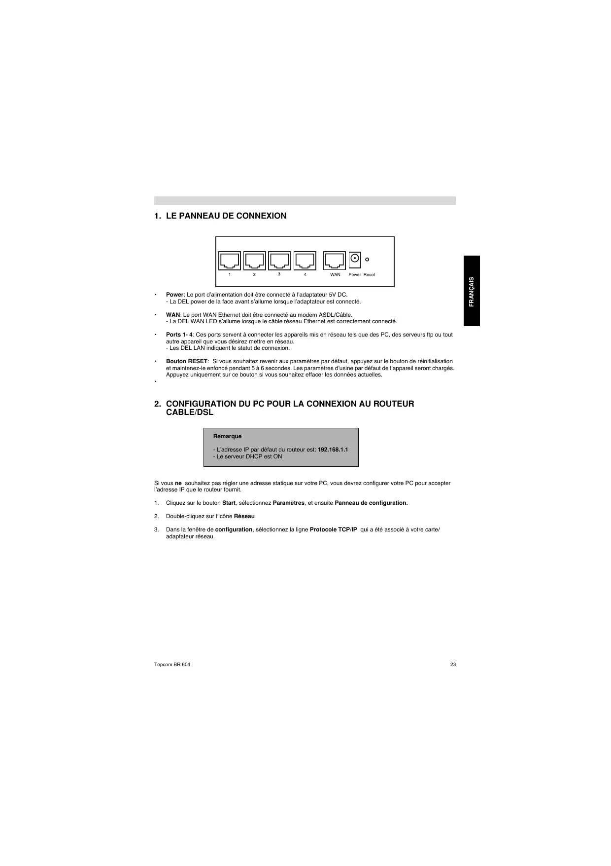 Topcom Broadband Router BR 604 FRANÇAIS Power: Le port d’alimentation doit être connecté à l’adaptateur 5V DC. - La DEL power de la face avant s’allume lorsque l’adaptateur est connecté.