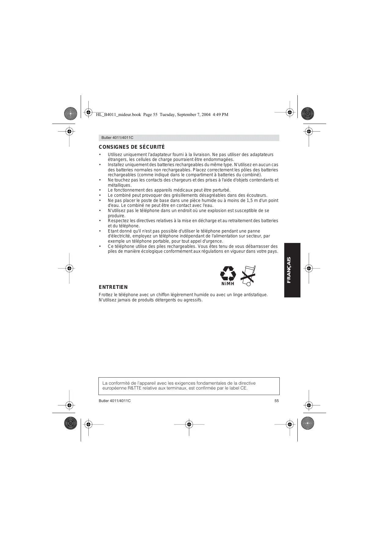 N iMH Frottez le téléphone avec un chiffon légèrement humide ou avec un linge antistatique. N'utilisez jamais de produits détergents ou agressifs. La conformité de l’appareil avec les exigences fondamentales de la directive européenne R&TTE relative aux terminaux, est confirmée par le label CE. Butler 4011/4011C