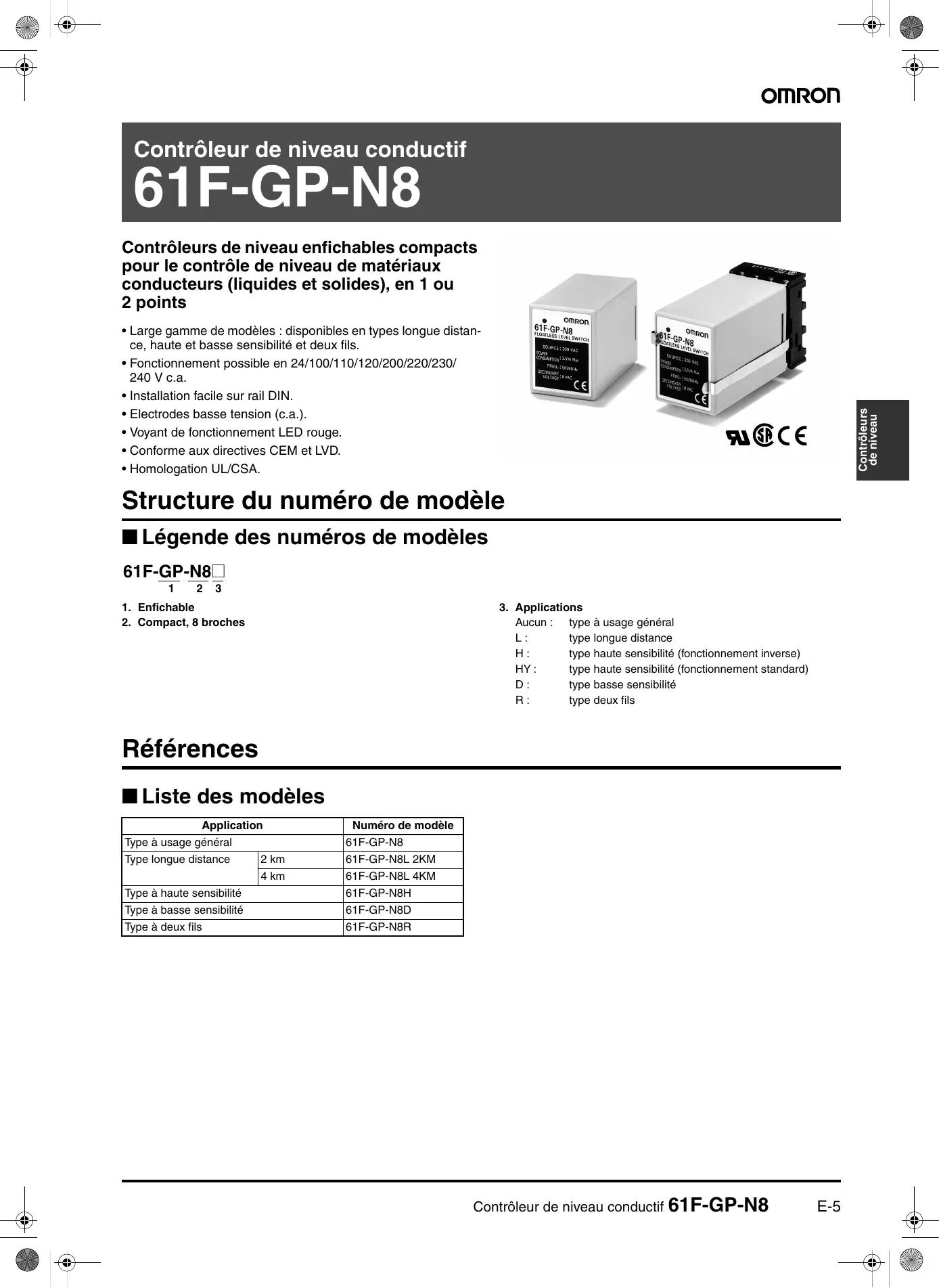 | Caractéristiques techniques principales | Modèle OMRON 61F-GP-N8, conçu pour le contrôle de niveaux de liquides dans divers environnements industriels. |
