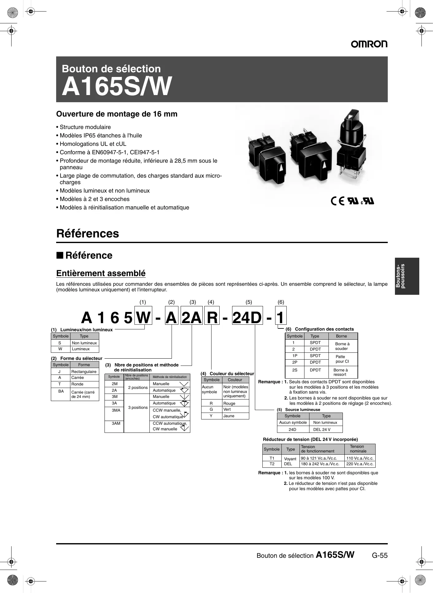 A165S-A3M-2 Note : Entrez le symbole de la couleur désirée pour le sélecteur dans le @: R (rouge), Y (jaune), G (vert). Le sélecteur des modèles non lumineux est noir. Bouton de sélection A165S/W G-57 Boutonspoussoirs Nombre d'encoches Modèles A165@-T (ronds) IP65 étanche à l'huile Nombre d'encoches 2 encoches Sortie SPDT Méthode de réinitialisation Manuelle Automatique DPDT Manuelle Automatique 3 encoches DPDT Manuelle Méthode d'éclairage Tension de fonctionnement Modèle DEL 24 V c.c. A165W-T2M@-24D-1 Non lumineux
