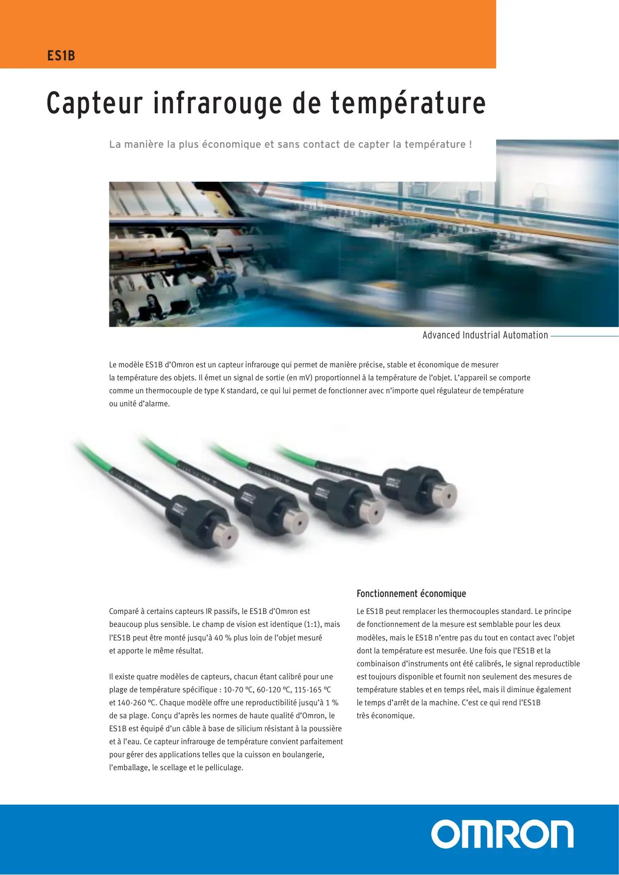Le modele ES1B d'Omron est un capteur infrarouge qui permet de maniere précise, stable et economique de mesurer la température des objets. Il émet un signal de sortie (en mV) proportionnel à la température de l'objet. L'appareil se comporte comme un thermocouple de type K standard, ce qui lui permit de fonctionner avec n'importe quel régulateur de température ou unité d'alarme.