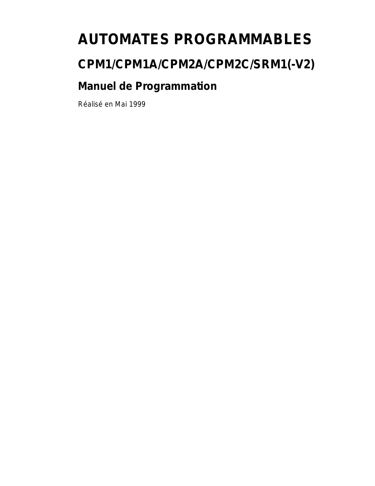 Cat. No. W353-E1-1 SYSMAC CPM1/CPM1A/CPM2A/CPM2C/SRM1(-V2) Automate programmable MANUEL DE PROGRAMMATION AUTOMATES PROGRAMMABLES CPM1/CPM1A/CPM2A/CPM2C/SRM1(-V2) Manuel de Programmation Réalisé en Mai 1999 Avis : Les produits OMRON sont conçus pour être utilisés par un opérateur qualifié, en respectant des procédures appropriées et uniquement dans le cadre de ce qui est précisé dans ce document. Dans ce manuel, les conventions suivantes permettent de spécifier et de classer les conseils d’utilisation. Toujours faire très attention aux informations qui sont données. Le non--respect des conseils d’utilisation stipulés peut blesser des personnes ou endommager des biens. ! DANGER Indique une situation dangereuse imminente qui, si elle n’est pas évitée, peut entraîner des blessures graves ou mortelles. ! AVERTISSEMENT ! Attention Indique une situation potentiellement dangereuse qui, si elle n’est pas évitée, peut provoquer des blessures graves ou mortelles. Indique une situation potentiellement dangereuse qui, si elle n’est pas évitée, peut provoquer de légères ou moyennes blessures ou endommager des biens. Références des produits OMRON Dans ce manuel, tous les noms de produits OMRON sont écrits en majuscules. Le mot “ unité ” désigne un produit OMRON, que la désignation de ce produit apparaisse ou nom dans le texte. L’abréviation “Ch,” qui figure sur certains affichages et sur certains produits OMRON signifie souvent “ word ” (“ mot ”) et, dans la documentation, il est souvent remplacé par l’abréviation “Wd”. L’abréviation “API” signifie Automate programmable industriel et n’est jamais utilisée comme abréviation d’un autre système, composant ou élément. Aides visuelles Les intitulés suivants apparaissent dans la colonne de gauche du manuel, pour vous aider à trouver différents types d’informations. Rem. Désigne des informations particulièrement intéressantes pour utiliser le produit de façon pratique et efficace. 1, 2, 3...