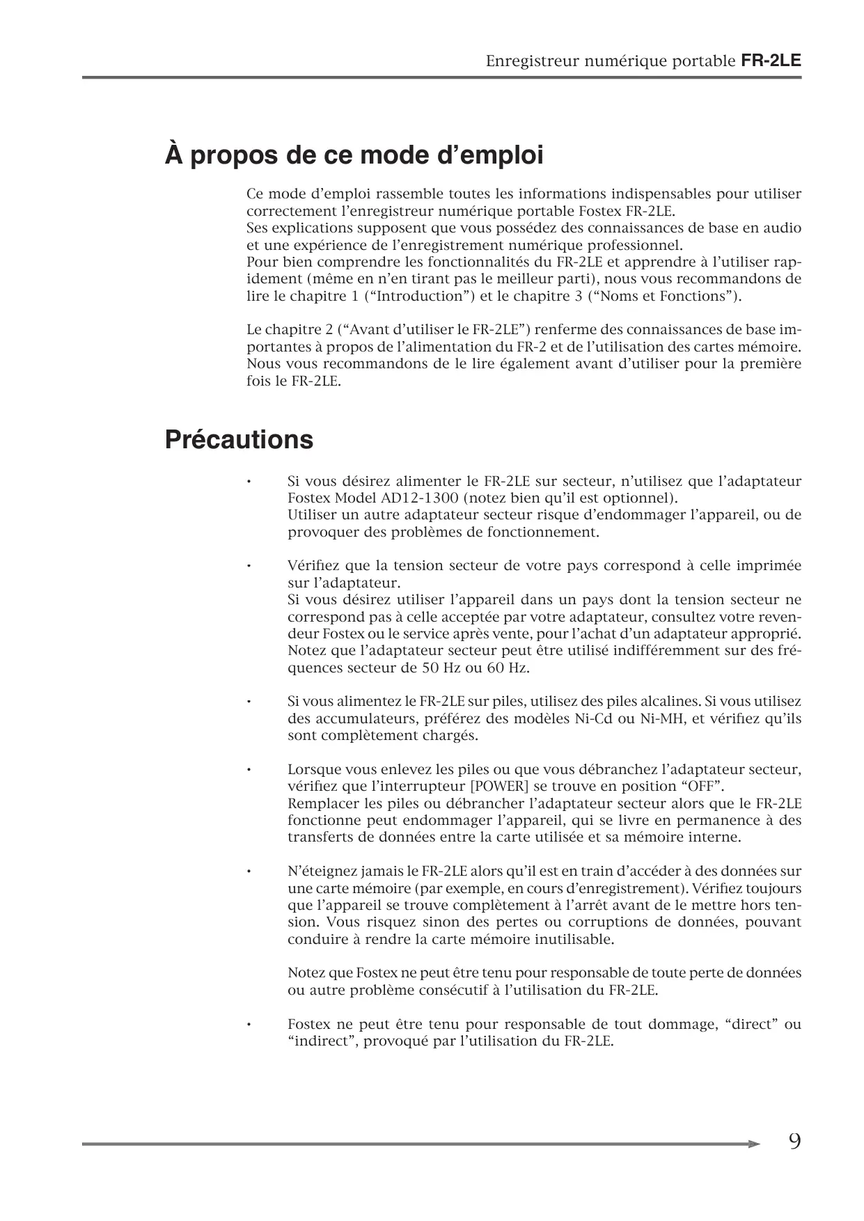 Ce chapitre contient quelques remarques sur l’alimentation du FR-2LE (dont la fonction Power Saving), ainsi que des précisions utiles sur les cartes mémoire qu’il utilise - notamment au sujet de leur formatage initial. Lisez ce chapitre avant d’utiliser le FR-2LE pour la première fois.