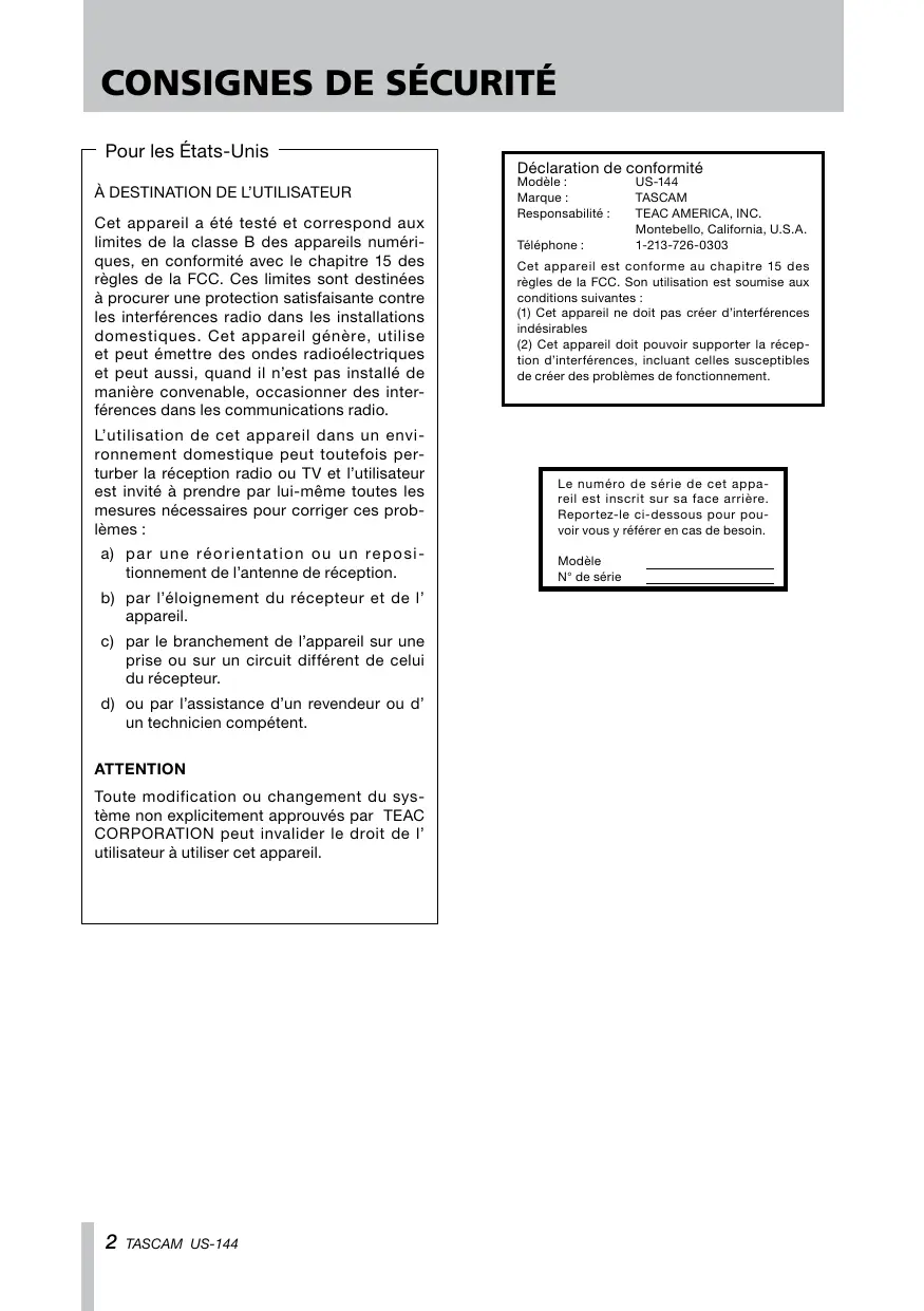 US-144 TASCAM TEAC AMERICA, INC. Montebello, California, U.S.A. 1-213-726-0303