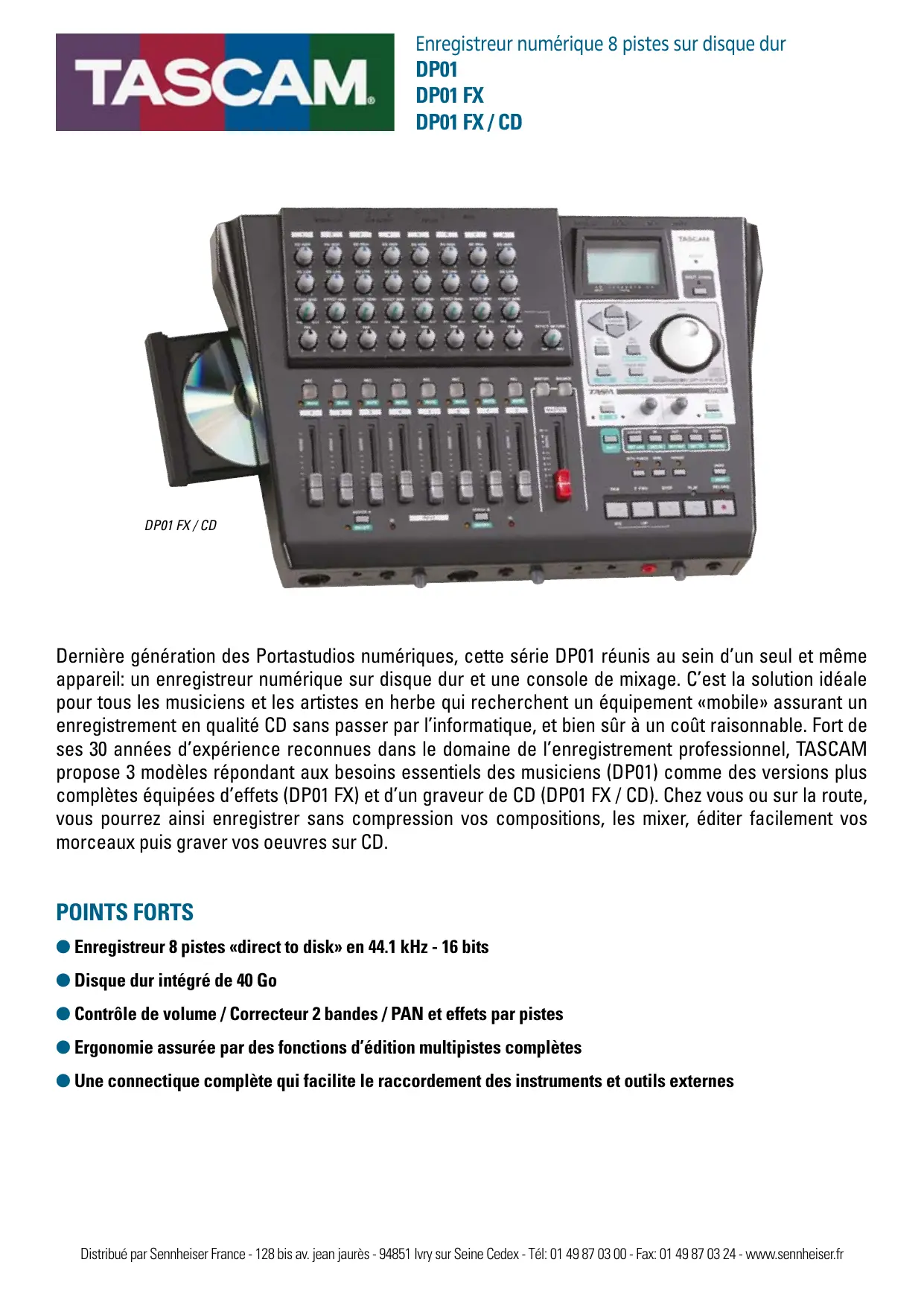 Enregistreur numérique 8 pistes sur disque dur DP01 DP01 FX DP01 FX / CD DP01 FX / CD Dernière génération des Portastudios numériques, cette série DP01 réunis au sein d’un seul et même appareil: un enregistreur numérique sur disque dur et une console de mixage. C’est la solution idéale pour tous les musiciens et les artistes en herbe qui recherchent un équipement «mobile» assurant un enregistrement en qualité CD sans passer par l’informatique, et bien sûr à un coût raisonnable. Fort de ses 30 années d’expérience reconnues dans le domaine de l’enregistrement professionnel, TASCAM propose 3 modèles répondant aux besoins essentiels des musiciens (DP01) comme des versions plus complètes équipées d’effets (DP01 FX) et d’un graveur de CD (DP01 FX / CD). Chez vous ou sur la route, vous pourrez ainsi enregistrer sans compression vos compositions, les mixer, éditer facilement vos morceaux puis graver vos oeuvres sur CD. POINTS FORTS Enregistreur 8 pistes «direct to disk» en 44.1 kHz - 16 bits Disque dur intégré de 40 Go Contrôle de volume / Correcteur 2 bandes / PAN et effets par pistes Ergonomie assurée par des fonctions d’édition multipistes complètes Une connectique complète qui facilite le raccordement des instruments et outils externes Distribué par Sennheiser France - 128 bis av. jean jaurès - 94851 Ivry sur Seine Cedex - Tél: 01 49 87 03 00 - Fax: 01 49 87 03 24 - www.sennheiser.fr Enregistreur numérique 8 pistes sur disque dur DP01 DP01 FX DP01 FX / CD DP01 DP01 FX DP01 FX / CD DPO1