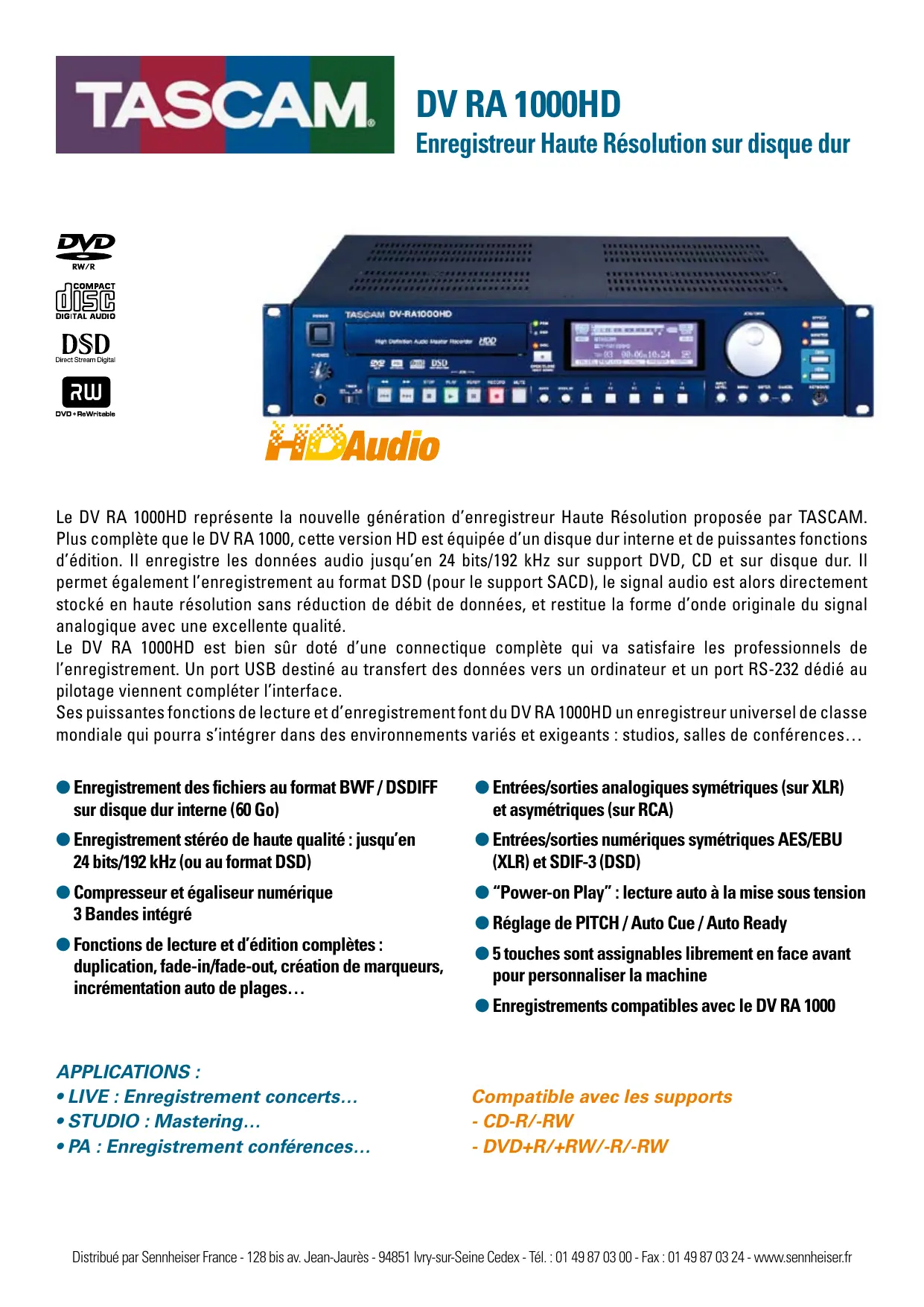 - DVD+R/+RW/-R/-RW Distribué par Sennheiser France - 128 bis av. Jean-Jaurès - 94851 Ivry-sur-Seine Cedex - Tél. : 01 49 87 03 00 - Fax : 01 49 87 03 24 - www.sennheiser.fr