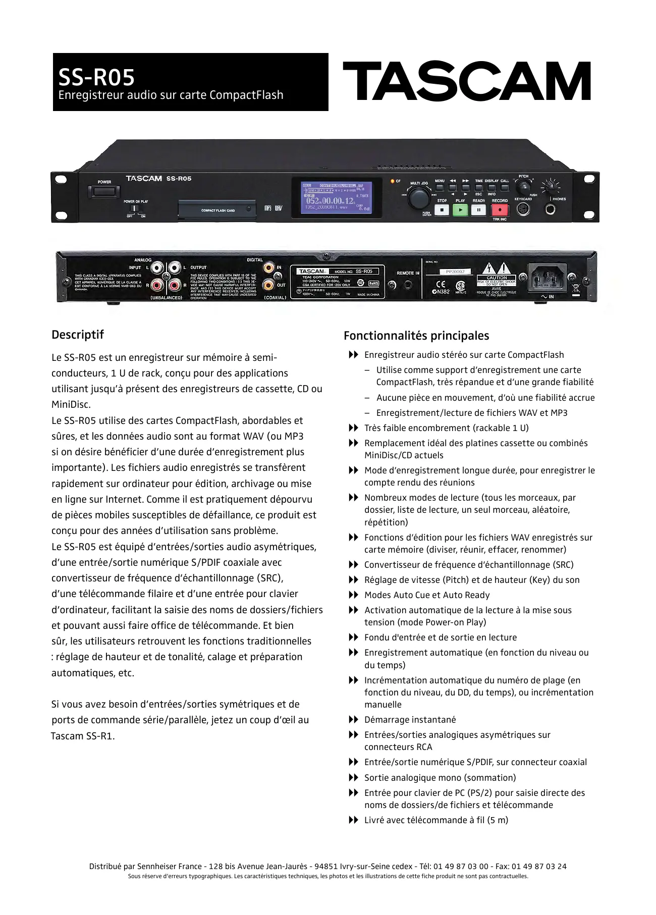 Distribué par Sennheiser France - 128 bis Avenue Jean-Jaurès - 94851 Ivry-sur-Seine cedex - Tél: 01 49 87 03 00 - Fax: 01 49 87 03 24