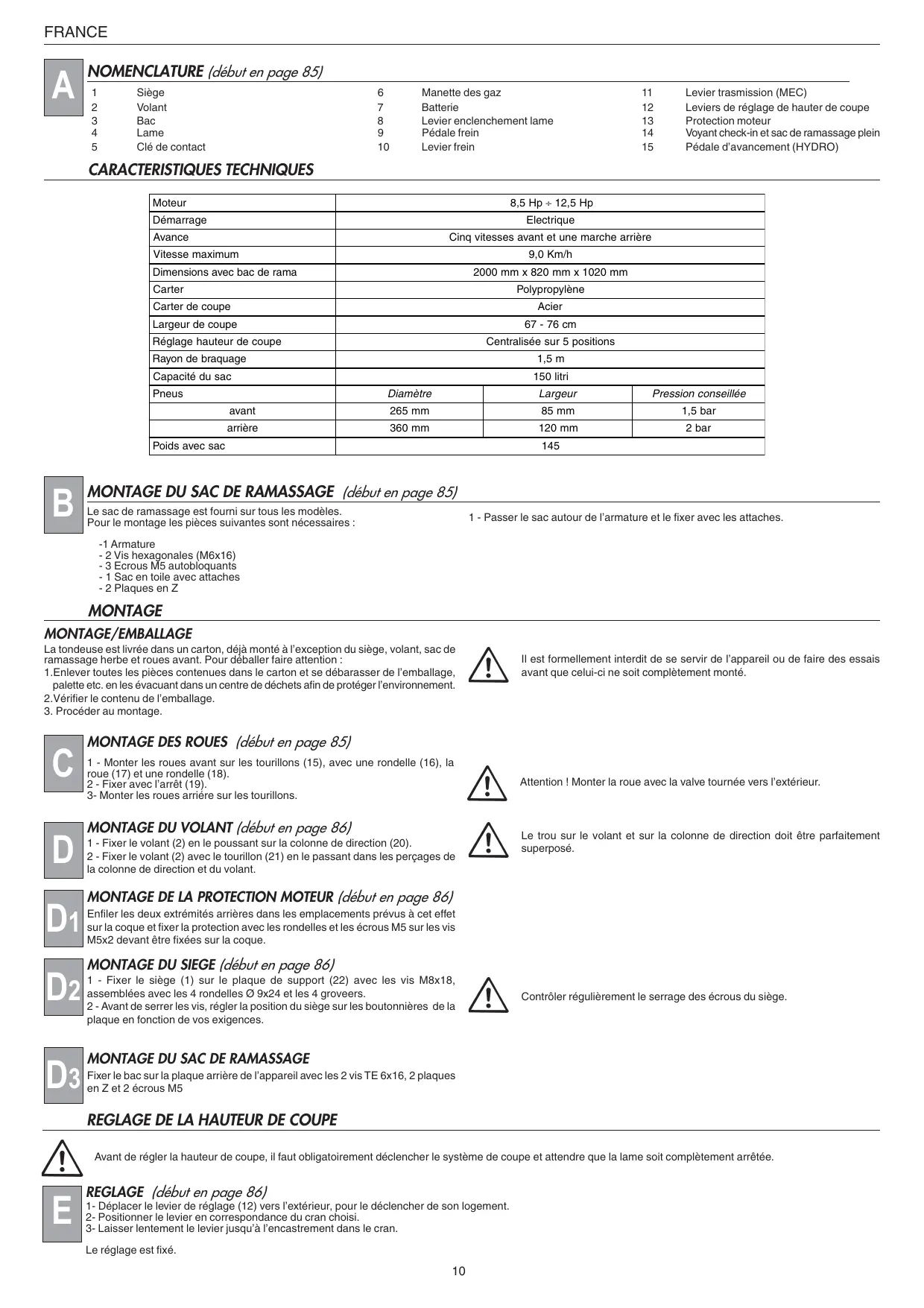 1) Veiller à ce que les écrous, les boulons et les vis soient parfaitement serrés, pour travailler en toute sécurité. 2) Si le réservoir contient encore du carburant, ne jamais laisser la machine dans des lieux où les vapeurs d'essence pourraient atteindre des flammes ou des étincelles. 3) Attendre le refroidissement du moteur avant de placer la machine dans un espace restreint. 4) Pour réduire les risques d'incendie, éliminer toute trace d'herbe, de feuilles ou de lubrifiant dans le moteur, le pot d'échappement, le compartiment de la batterie et le réservoir de carburant. 5) Contrôler souvent le bac à herbe pour vérifier l'absence de tout signe d'usure ou de détérioration. 6) Pour des raisons de sécurité, remplacer sans attendre les composants usés ou endommagés. 7) En cas de vidange du réservoir avant l'hiver, effectuer cette opération en plein air. 8) Monter les lames en suivant les instructions ; n'utiliser que des lames portant le numéro de série ainsi que le nom ou la marque du Constructeur ou du Fournisseur. 9) Pour protéger les mains lors des opérations de dépose/repose des lames, porter des gants spécifiques prévus à cet effet.