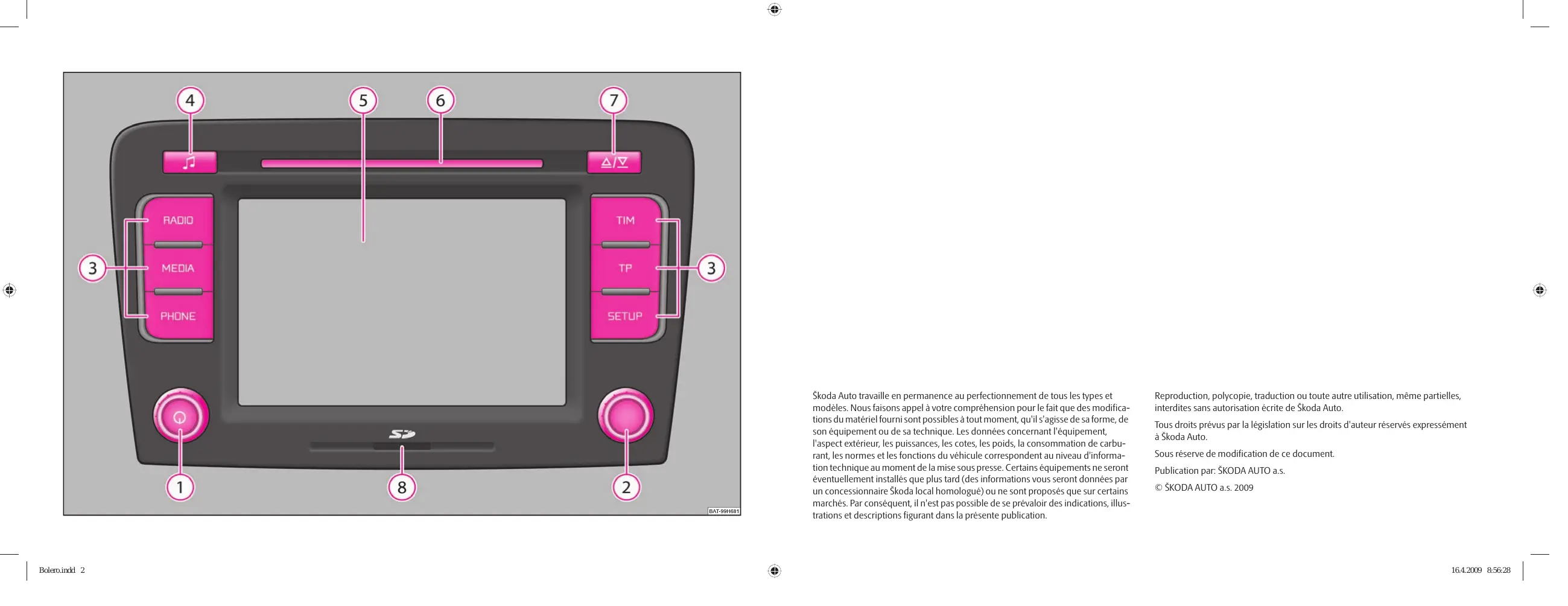 Škoda Auto travaille en permanence au perfectionnement de tous les types et modèles. Nous faisons appel à votre compréhension pour le fait que des modifications du matériel fourni sont possibles à tout moment, qu'il s'agisse de sa forme, de son équipement ou de sa technique. Les données concernant l'équipement, l'aspect extérieur, les puissances, les cotes, les poids, la consommation de carburant, les normes et les fonctions du véhicule correspondent au niveau d'information technique au moment de la mise sous presse. Certains équipements ne seront éventuellement installés que plus tard (des informations vous seront données par un concessionnaire Škoda local homologué) ou ne sont proposés que sur certains marchés. Par conséquent, il n'est pas possible de se prévaloir des indications, illustrations et descriptions figurant dans la présente publication. Bolero.indd 2 Reproduction, polycopie, traduction ou toute autre utilisation, même partielles, interdites sans autorisation écrite de Škoda Auto. Tous droits prévus par la législation sur les droits d'auteur réservés expressément à Škoda Auto. Sous réserve de modification de ce document. Publication par: ŠKODA AUTO a.s. © ŠKODA AUTO a.s. 2009