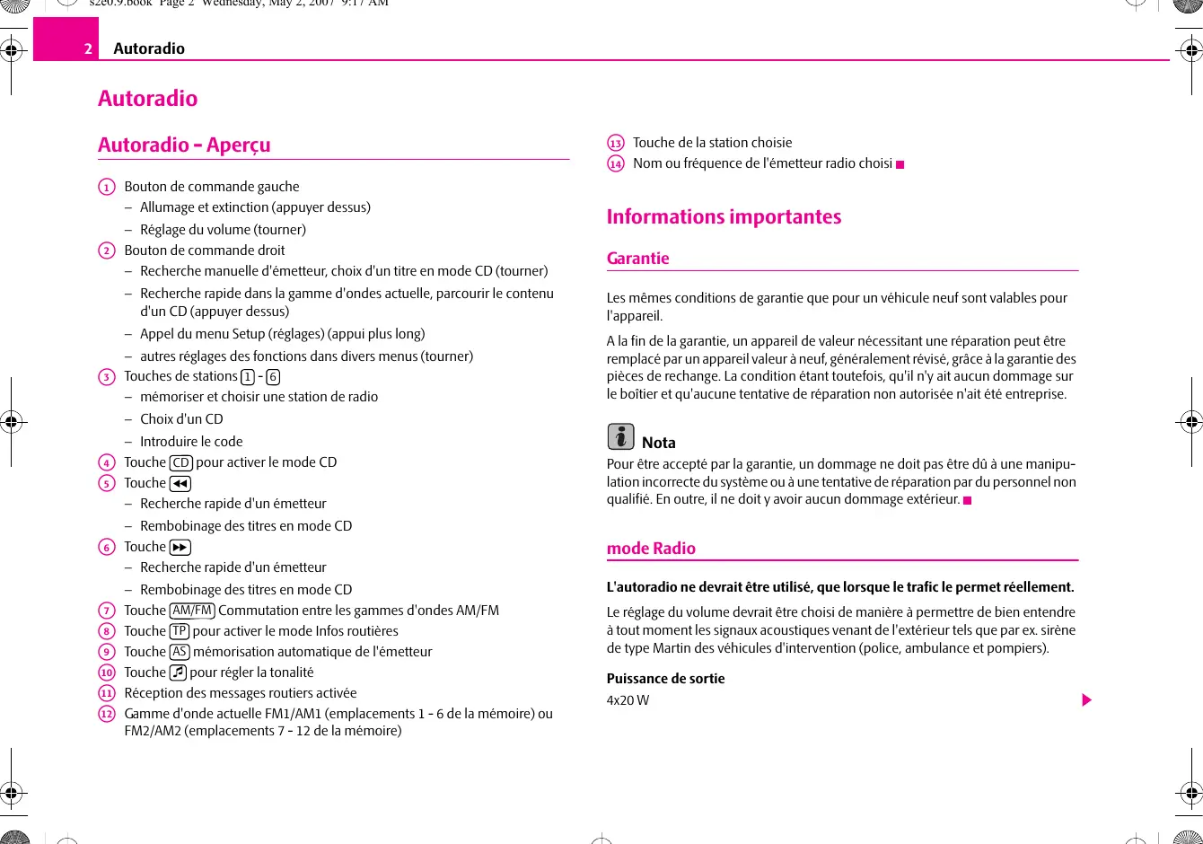 − autres réglages des fonctions dans divers menus (tourner) Touches de stations 1 - 6 − mémoriser et choisir une station de radio Informations importantes Garantie Les mêmes conditions de garantie que pour un véhicule neuf sont valables pour l'appareil. A la fin de la garantie, un appareil de valeur nécessitant une réparation peut être remplacé par un appareil valeur à neuf, généralement révisé, grâce à la garantie des pièces de rechange. La condition étant toutefois, qu'il n'y ait aucun dommage sur le boîtier et qu'aucune tentative de réparation non autorisée n'ait été entreprise. − Choix d'un CD − Introduire le code CD pour activer le mode CD 4 Touche 5 Touche