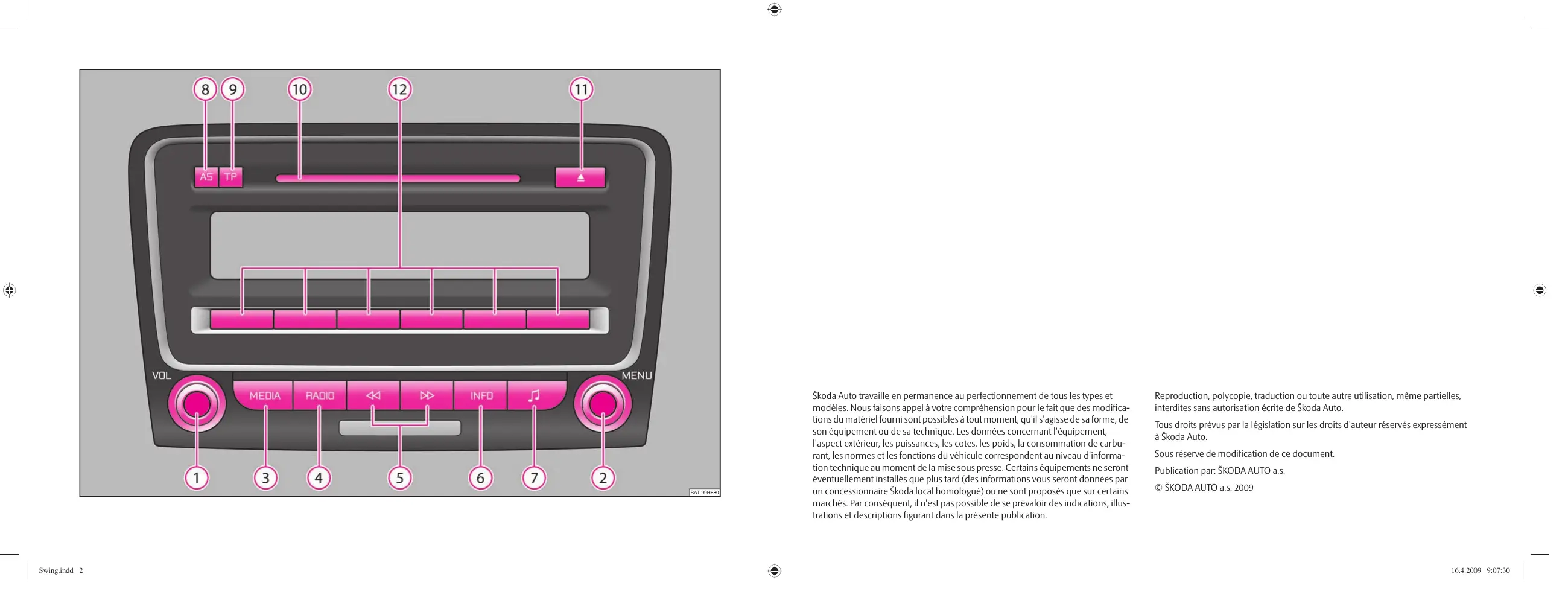 vol Pa MEDIA RADIO [exromseo] Swingindd 2 Skoda Auto travaille en permanence au perfectionnement de tous les types et modèles, Nous faisons appel à votre compréhension pour le fait que des modifica- tions du matériel fourni sont possibles à toutmoment, qu'il s'agisse de sa forme, de son équipement ou de sa technique. Les données concernant l'équipement, l'aspect extérieur, les puissances, les cotes, les poids, la consommation de carbu- rant, les normes et les fonctions du véhicule correspondent au niveau d'informa- tion technique au moment de la mise sous presse. Certains équipements ne seront éventuellement installés que plus tard (des informations vous seront données par un concessionnaire Skoda local homologué) ou ne sont proposés que sur certains marchés. Par conséquent, il n'est pas possible de se prévaloir des indications, illus- trations et descriptions figurant dans la présente publication Reproduction, polycopie, traduction ou toute autre utilisation, même partielles, interdites sans autorisation écrite de Skoda Auto. ous droits prévus par la législation sur les droits d'auteur réservés expressément à Skoda Auto. Sous réserve de modification de ce document. Publication par: SKODA AUTO a.s © SKODA AUTO a:s. 2009 1642009 9:07:30