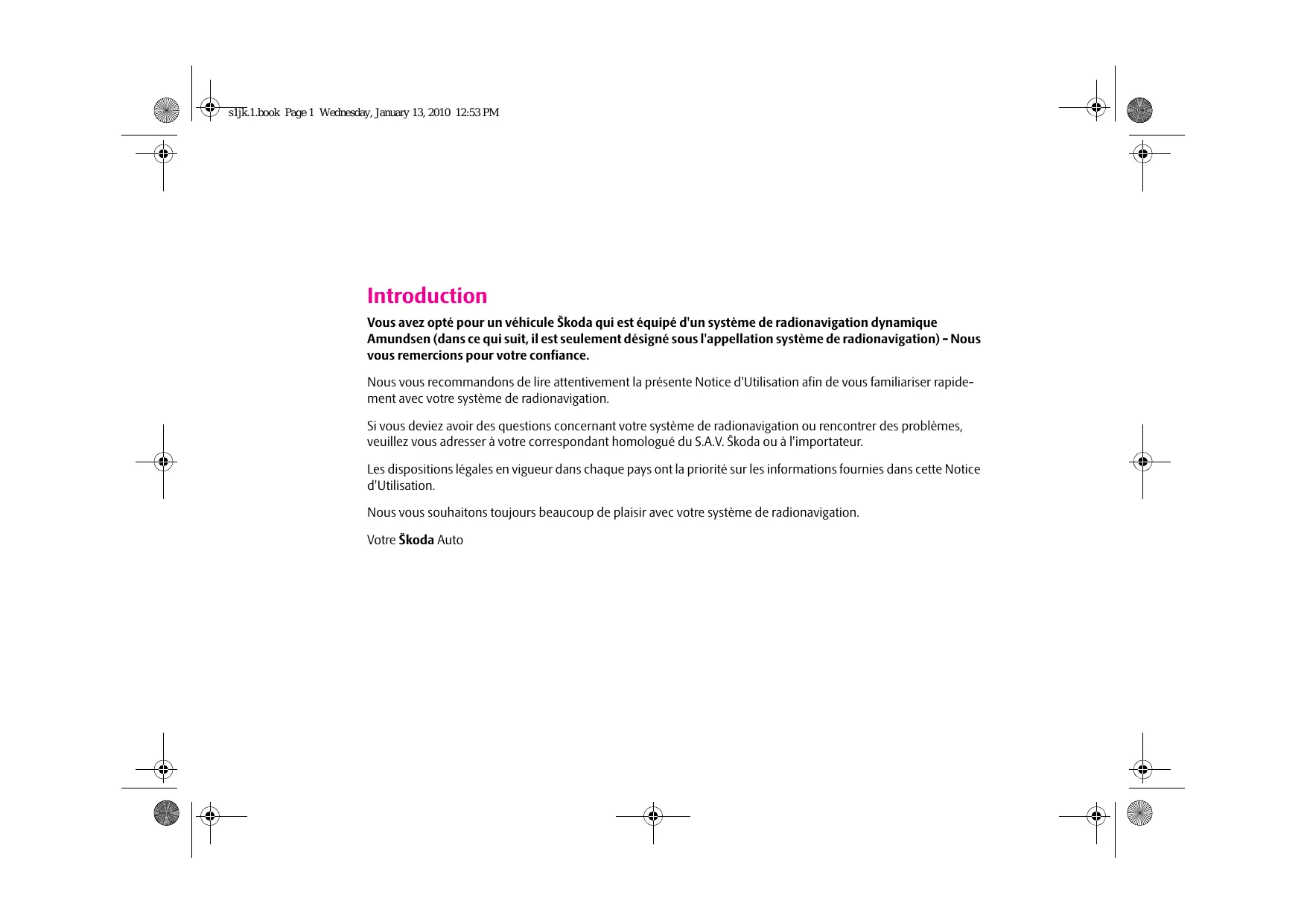 www.skoda-auto.com Navigace Amundsen Fabia, Roomster, Yeti, Octavia, Superb francouzsky 03.10 S00.5610.69.40 3T0 012 149 CN ŠkodaAuto LE SYSTÈME RADIO ET NAVIGATION AMUNDSEN s1jk.1.book Page 1 Wednesday, January 13, 2010 12:53 PM Introduction Vous avez opté pour un véhicule Škoda qui est équipé d'un système de radionavigation dynamique Amundsen (dans ce qui suit, il est seulement désigné sous l'appellation système de radionavigation) - Nous vous remercions pour votre confiance. Nous vous recommandons de lire attentivement la présente Notice d'Utilisation afin de vous familiariser rapidement avec votre système de radionavigation. Si vous deviez avoir des questions concernant votre système de radionavigation ou rencontrer des problèmes, veuillez vous adresser à votre correspondant homologué du S.A.V. Škoda ou à l'importateur. Les dispositions légales en vigueur dans chaque pays ont la priorité sur les informations fournies dans cette Notice d'Utilisation. Nous vous souhaitons toujours beaucoup de plaisir avec votre système de radionavigation. Votre Škoda Auto s1jk.1.book Page 2 Wednesday, January 13, 2010 12:53 PM