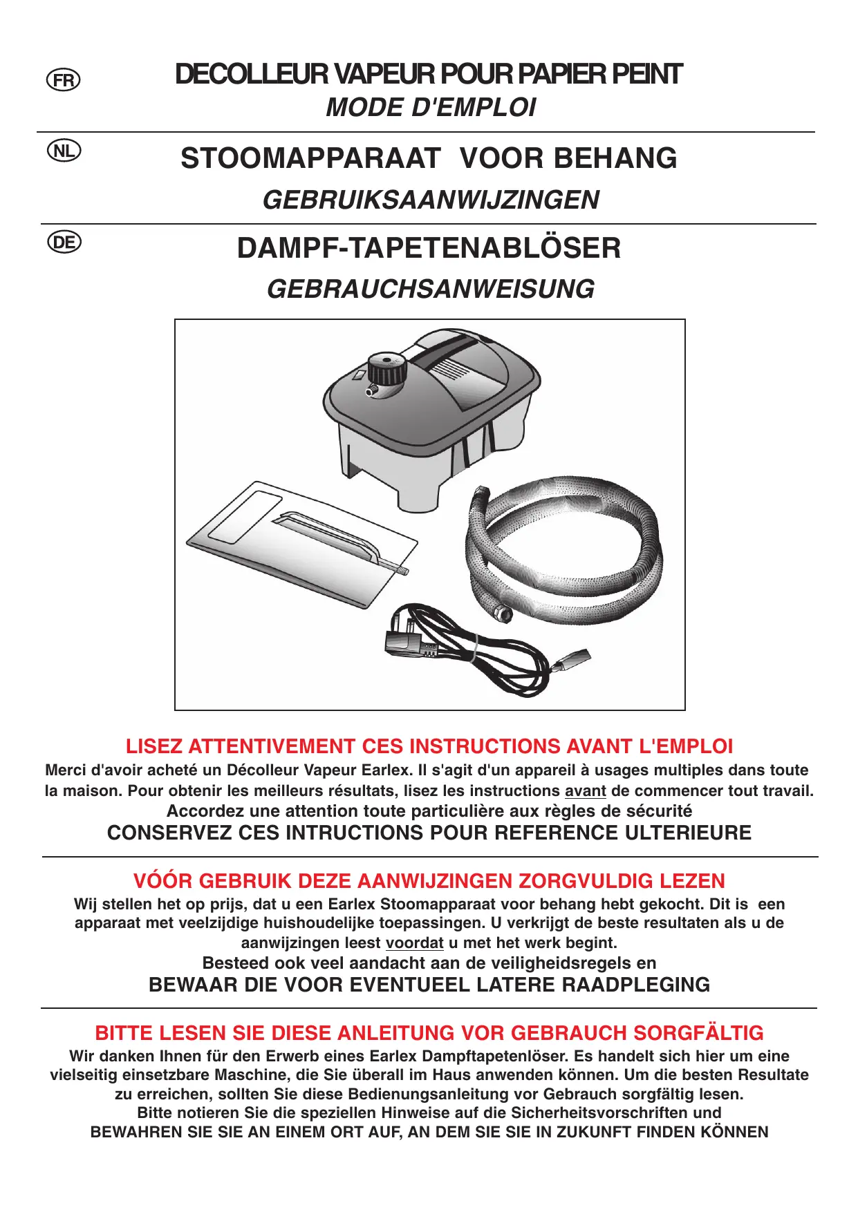 Merci d'avoir acheté un Décolleur Vapeur Earlex. Il s'agit d'un appareil à usages multiples dans toute la maison. Pour obtenir les meilleurs résultats, lisez les instructions avant de commencer tout travail. Accordez une attention toute particulière aux règles de sécurité