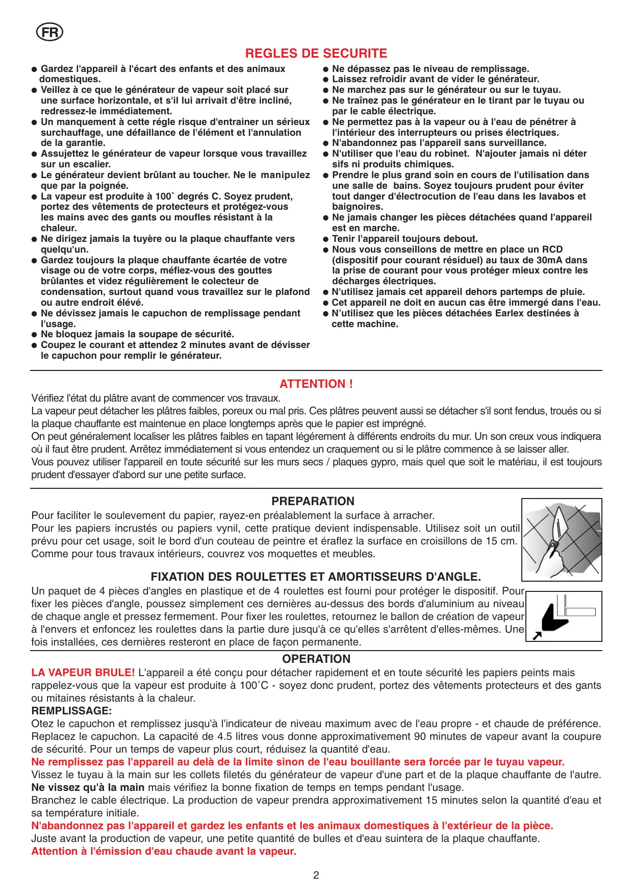 LA VAPEUR BRULE! L'appareil a été conçu pour détacher rapidement et en toute sécurité les papiers peints, mais rappelez-vous que la vapeur est produite à 100°C - soyez donc prudent, portez des vêtements protecteurs et des gants ou mitaines résistantes à la chaleur.