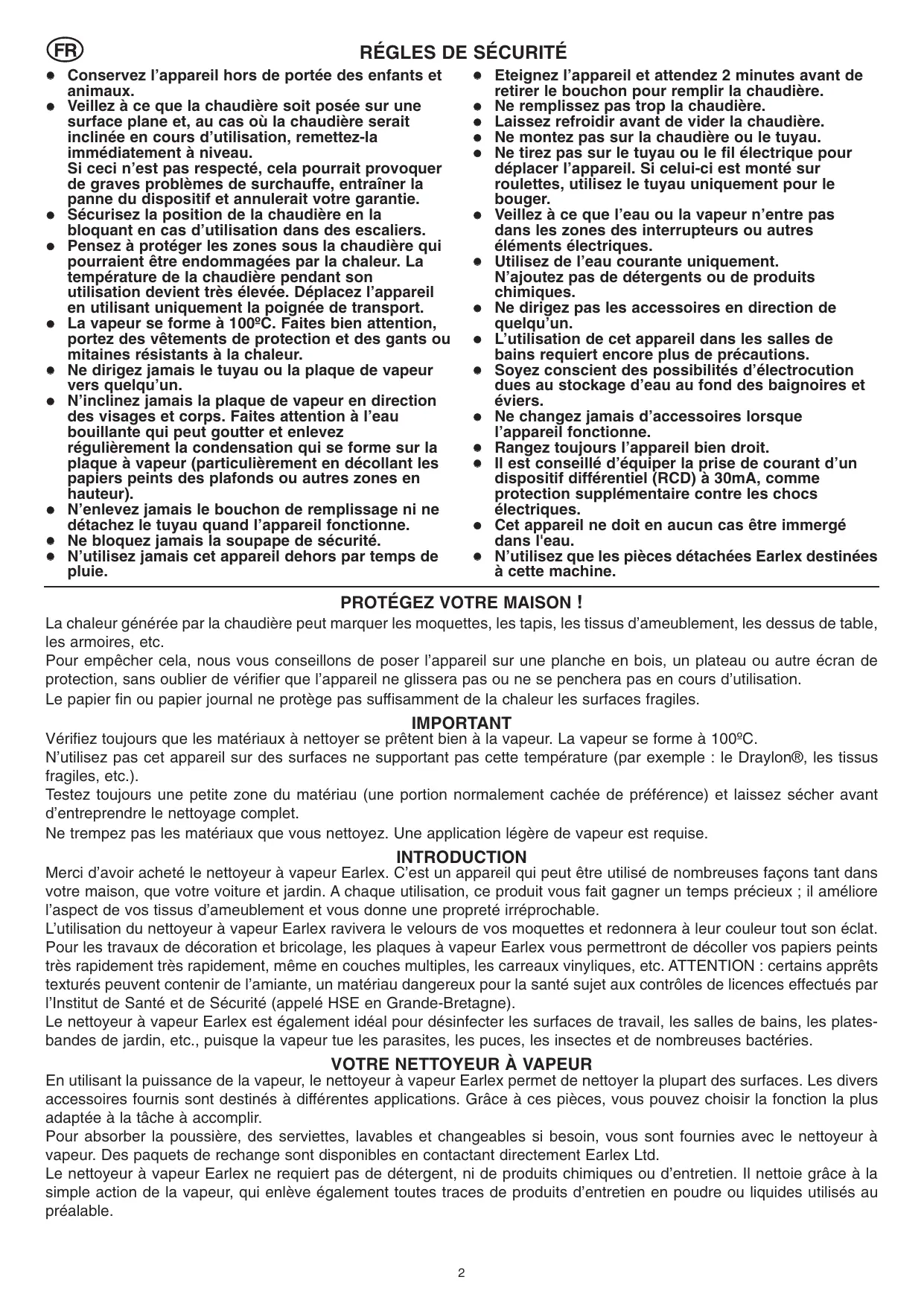 Merci d'avoir acheté un nettoyeur à vapeur Earlex. Afin d'optimiser les performances de ce produit, veuillez lire ses instructions avant de commencer tout travail. Veuillez également prendre connaissance des règles de sécurité.