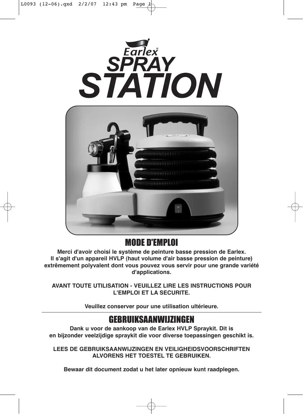L0093 (12-06).qxd 2/2/07 12:43 pm Page 1 MODE D'EMPLOI Merci d'avoir choisi le système de peinture basse pression de Earlex. Il s'agit d'un appareil HVLP (haut volume d'air basse pression de peinture) extrêmement polyvalent dont vous pouvez vous servir pour une grande variété d'applications. AVANT TOUTE UTILISATION - VEUILLEZ LIRE LES INSTRUCTIONS POUR L'EMPLOI ET LA SECURITE. Veuillez conserver pour une utilisation ultérieure. GEBRUIKSAANWIJZINGEN Dank u voor de aankoop van de Earlex HVLP Spraykit. Dit is en bijzonder veelzijdige spraykit die voor diverse toepassingen geschikt is.