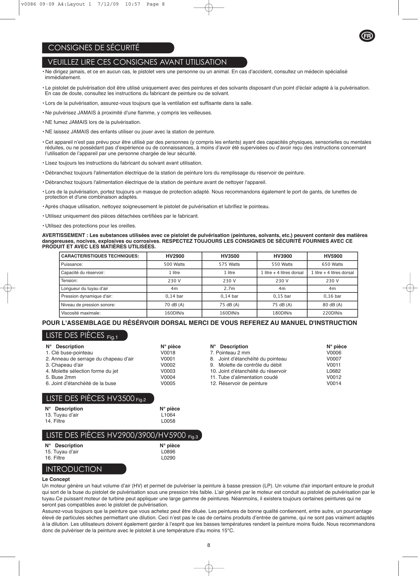 N° pièce L0896 L0290 Fig.3 Le Concept Un moteur génère un haut volume d’air (HV) et permet de pulvériser la peinture à basse pression (LP). Un volume d'air important entoure le produit qui sort de la buse du pistolet de pulvérisation sous une pression très faible. L’air généré par le moteur est conduit au pistolet de pulvérisation par le tuyau.Ce puissant moteur de turbine peut appliquer une large gamme de peintures. Néanmoins, il existera toujours certaines peintures qui ne seront pas compatibles avec le pistolet de pulvérisation. Assurez-vous toujours que la peinture que vous achetez peut être diluée. Les peintures de bonne qualité contiennent, entre autre, un pourcentage élevé de particules sèches permettant une dilution. Ceci n’est pas le cas de certains produits d’entrée de gamme, qui ne sont pas vraiment adaptés à la dilution. Les utilisateurs doivent également garder à l’esprit que les basses températures rendent la peinture moins fluide. Nous recommandons donc de pulvériser de la peinture avec le pistolet à une température d'au moins 15°C.