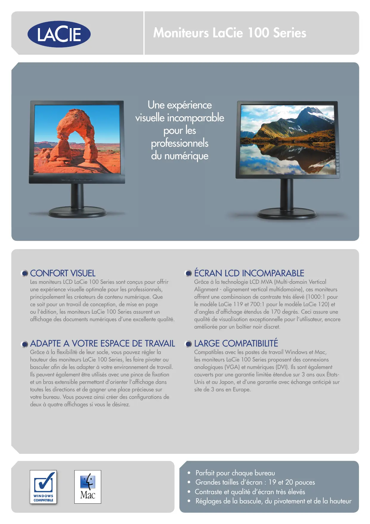 Grâce à la technologie LCD MVA (Multi-domain Vertical Alignment - alignement vertical multidomaine], ces moniteurs offrent une combinaison de contraste très élevé (1000:1 pour le modèle LaCie 119 et 700:1 pour le modèle LaCie 120] et d'angles d'affichage étendus de 170 degrés. Ceci assure une qualité de visualisation exceptionnelle pour l'utilisateur, encore améliorée par un boîtier noir discret. © LARGE COMPATIBILITÉ Compatibles avec les postes de travail Windows et Mac, les moniteurs LaCie 100 Series proposent des connexions analogiques (VGA) et numériques (DVI). Ils sont également couverts par une garantie limitée étendue sur 3 ans aux États- Unis et au Japon, et d'une garantie avec échange anticipé sur site de 3 ans en Europe. Parfait pour chaque bureau Grandes tailles d'écran : 19 et 20 pouces Contraste et qualité d'écran très élevés Réglages de la bascule, du pivotement et de la hauteur