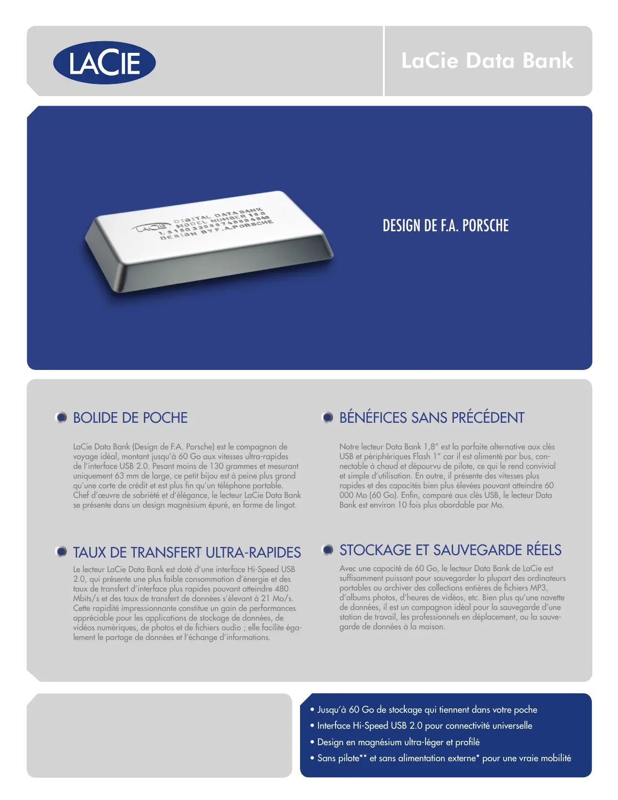 @ BOLIDE DE POCHE © BÉNÉFICES SANS PRÉCÉDENT LaCie Data Bank (Design de FA. Porsche] est le compagnon de Notre lecteur Data Bank 1,8 est la parfai voyage idéal, montant jusqu'à 60 Go aux vitesses u USB ei é 1” car il est a de l'interface USB 2.0. Pesant moins de 130 grami nectable à chaud et dépourvu de pilote, uniquement 63 mm de large, c sst à et sim, tilis En outre, il pré phone portable r LaCie Data Bank en forme de lingot ne carte de crédit et est pl @ TAUX DE TRANSFERT ULTRA-RAPIDES ® STOCKAGE ET SAUVEGARDE RÉELS cité de 60 Go, le lecteur Data Bank de LaCie est la plupart des ordinateurs uvegard ible pour | ‘ment, ou la sauve- umériqu lement le partage + Jusqu'à 60 Go de stockage qui tiennent dans votre poche